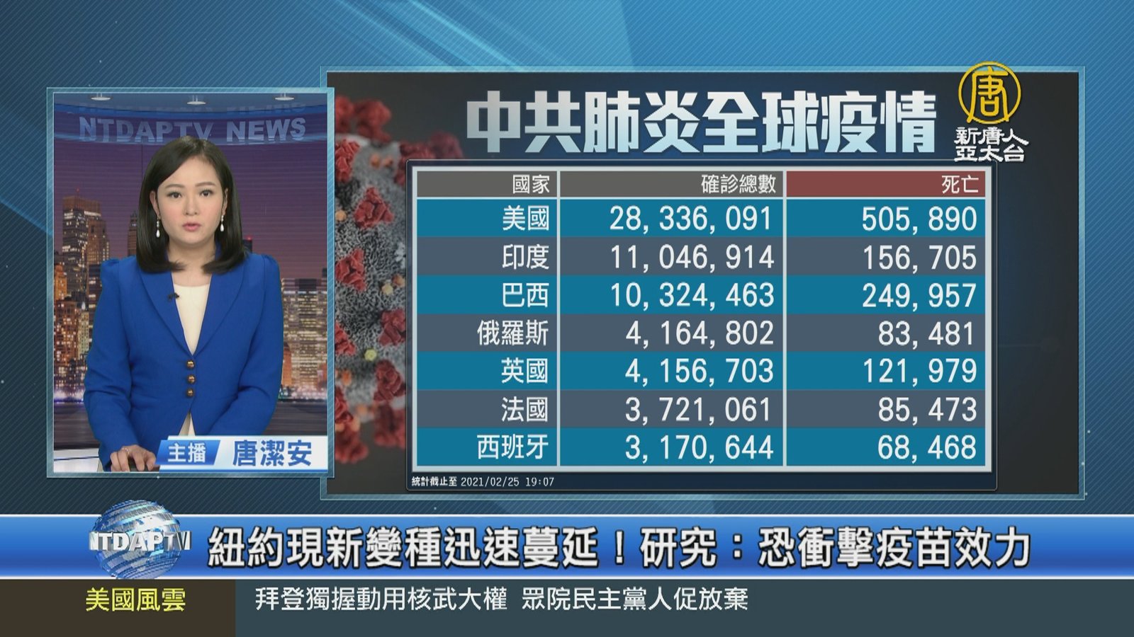 接著來關心,中共肺炎疫情最新情況,全球確診超過1億1千2百60萬人,死亡2百49萬多人。但中共、伊朗等國家,被認為嚴重低報數據。疫情最嚴重的美國,目前累計確診超過2千8百33萬人,死亡50萬5千多人。紐約發現新變種病毒「B.1.526」,並已迅速傳播,研究指出,這將衝擊原有疫苗效力。另外,紐約州政府去年訂購高達11億美元的抗疫物資,因缺乏審查,有三分之一的貨款需向賣方追討,其中牽扯到中國供貨方。日本傳出第11名國會議員,木村英子染疫。巴西聖保羅州患者住院率創下新高,將從26日起實施全州宵禁。法國北部城市, //asset3.ntdtv.com.tw/public/uploads/assets/2021/02/25/2021-02-25-6037968c3b19d.mp4 阿拉斯加州長|木村英子|聖保羅州|宵禁|敦克爾克|封城|英國變種病毒|住院率|中共肺炎|武漢肺炎|疫情|防疫|中共病毒|新型冠狀病毒2021-02-25 20:53:22