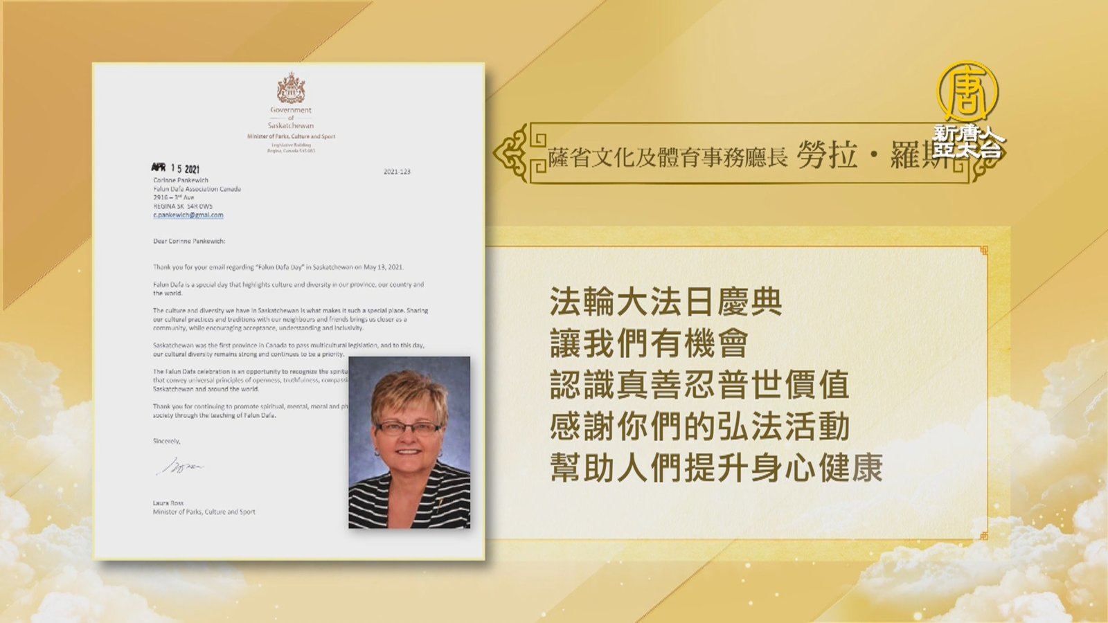 5月13日是世界法輪大法日,也是法輪功創始人李洪志先生的70歲華誕。加拿大各省市政要,紛紛發來賀信及褒獎,讚揚法輪大法給世界帶來的美好。 //asset1.ntdtv.com.tw/public/uploads/assets/2021/05/06/2021-05-06-6093eb6d3f5d7.mp4 513|世界法輪大法日|李洪志先生|70歲華誕|加拿大|政要賀信2021-05-06 21:10:07