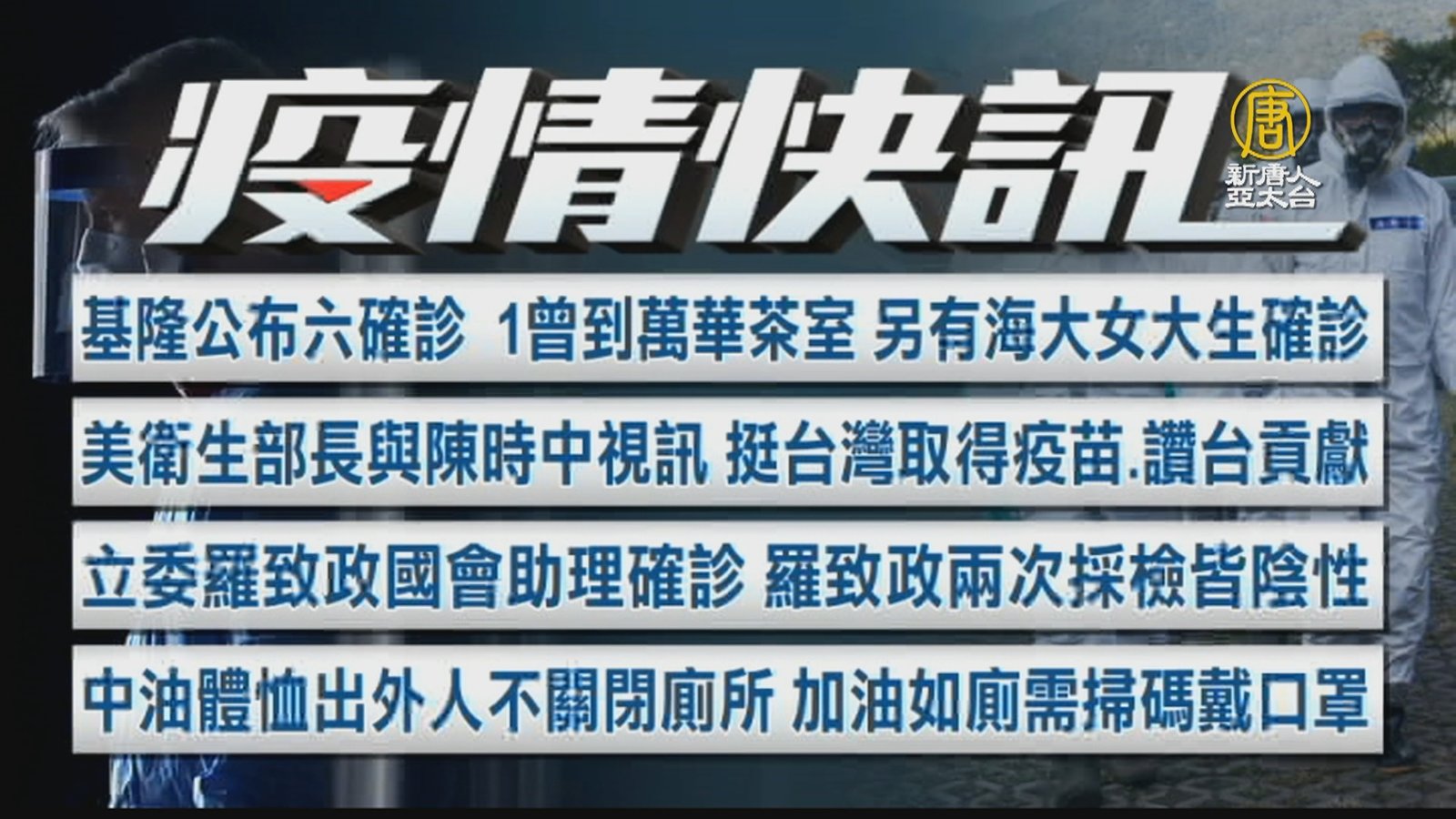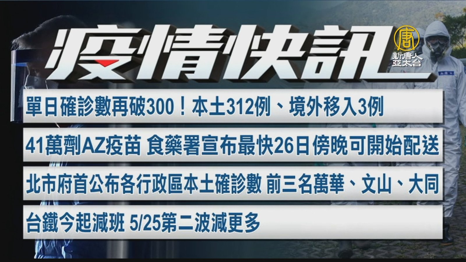 看到今天的台灣疫情快訊。單日確診數再破300例,本土312例、境外移入3例。41萬劑AZ疫苗,食藥署宣布最快26日傍晚可開始配送。北市府首度公布各行政區本土確診數,前三名分別是萬華、文山與大同區。台鐵今天起減班,5月25日第二波減更多。 //asset1.ntdtv.com.tw/public/uploads/assets/2021/05/21/2021-05-21-60a7a4754be72.mp4 中共肺炎|武漢肺炎|疫情|防疫|中共病毒|新型冠狀病毒2021-05-21 20:12:25