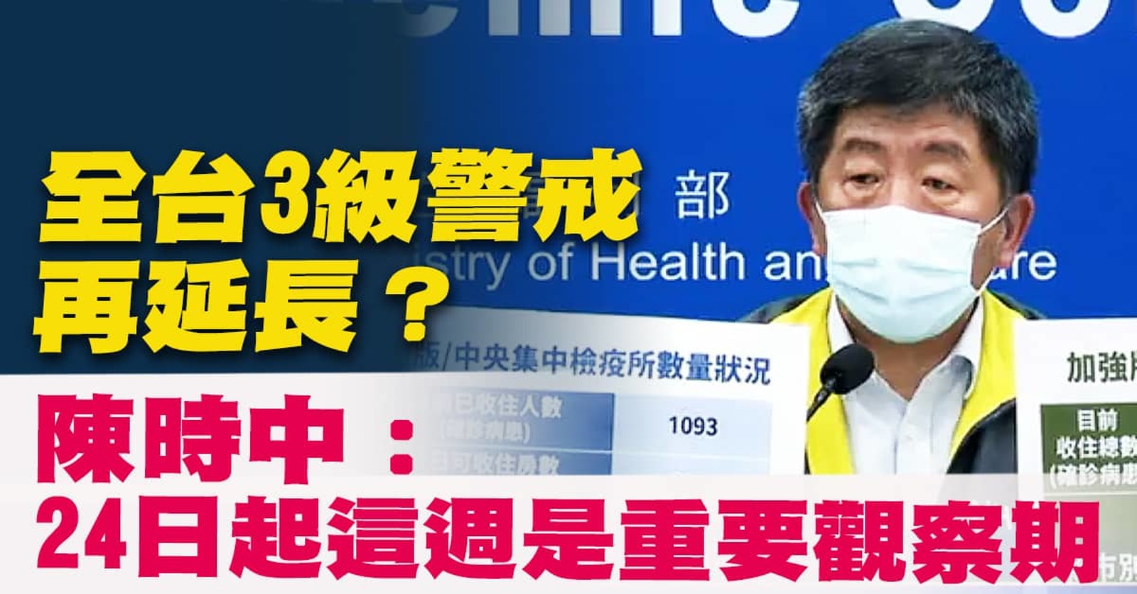 新聞一開始,持續帶您關心台灣疫情,今天(24日)防疫指揮中心宣布,新增334例本土個案,加上256例的校正回歸,共新增595案,另外,還增加6名死亡個案。在防疫記者會上,指揮官陳時中也表示,目前正在研議要延長3級警戒。 //asset1.ntdtv.com.tw/public/uploads/assets/2021/05/24/2021-05-24-60aba71d30166.mp4 中共肺炎|防疫|疫情|本土疫情|校正回歸|死亡個案|三級警戒2021-05-24 21:16:13
