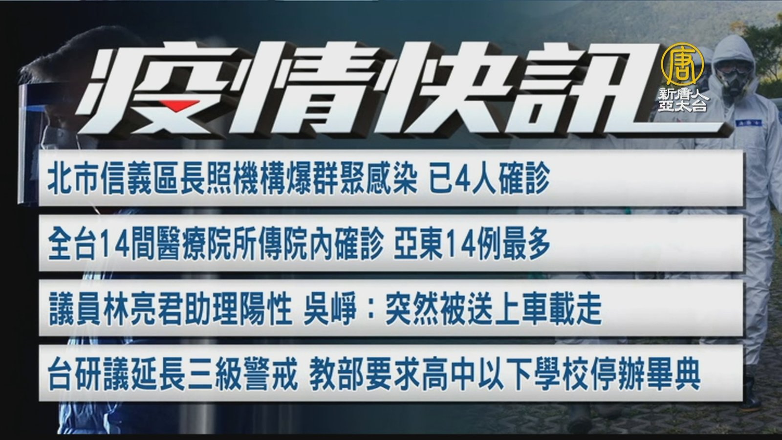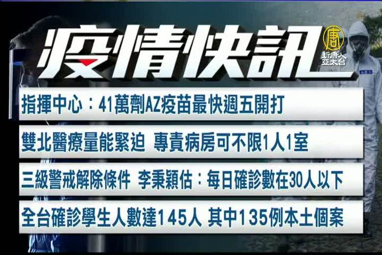 新聞一開始,先帶您鎖定,全國三級警戒,確定延長到6月14日,指揮官陳時中(25日)表示,疫情的趨勢沒有急劇惡化,但因為各地的陽性率還是很高,社區可能還有隱藏病例沒被發現,因此決定延長,但沒有升四級的打算。另外,全台停課不停學,也同步延長到6月14日。 //asset1.ntdtv.com.tw/public/uploads/assets/2021/05/25/2021-05-25-60aceaaa21694.mp4 第三級警戒|中共肺炎|武漢肺炎|疫情|防疫|中共病毒|新型冠狀病毒2021-05-25 20:42:05
