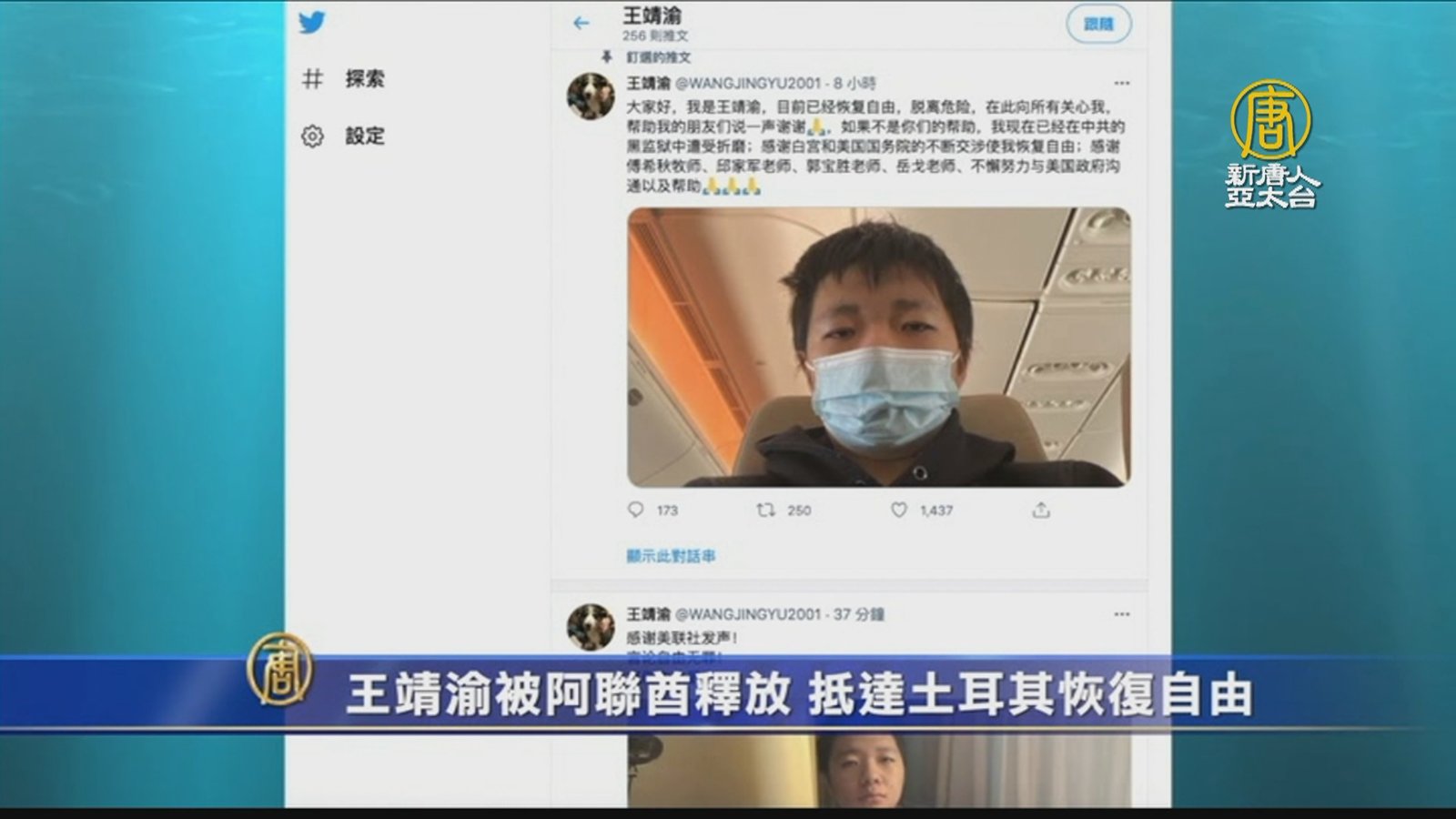 19歲中國大陸重慶青年王靖渝,因為在海外言論,遭中共跨國追捕。最近在阿拉伯聯合大公國杜拜轉機美國時,遭當地警方以不充足理由抓捕關押。週四,在美國政府干預下,重獲自由,目前已抵達土耳其。不過他在飛往美國前,卻發現放在飯店的護照被偷走;另外,女友專程趕來阿聯酋營救他,卻在與阿聯酋警察、中共使館官員見面後,失去聯繫。 //asset3.ntdtv.com.tw/public/uploads/assets/2021/05/28/2021-05-28-60b0ef5e9733c.mp4 阿拉伯聯合大公國|王靖渝|中印邊境陣亡士兵|中共跨境追捕|轉機2021-05-28 22:36:15