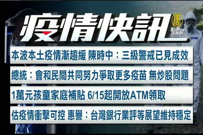 來看今天的疫情快訊:本波本土疫情漸趨緩,指揮中心指揮官表示:三級警戒已見成效。總統今天下午線上記者會指出:會和民間共同努力爭取更多疫苗 無炒股問題。1萬元孩童家庭補貼, 6/15起開放ATM領取。預估疫情衝擊可控,國際信評機構惠譽認為:台灣銀行業評等展望維持穩定。 //asset2.ntdtv.com.tw/public/uploads/assets/2021/05/31/2021-05-31-60b4d43d08191.mp4 三級警戒|中共肺炎|武漢肺炎|疫情|防疫|中共病毒|新型冠狀病毒2021-05-31 20:15:35