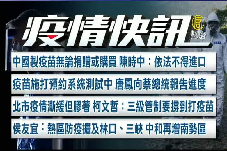 來看今天的疫情快訊。陳時中今天表示,中國製疫苗無論捐贈或購買,依法不得進口。疫苗施打預約系統測試中,行政院政務委員唐鳳向蔡總統報告進度。北市疫情逐漸趨緩但呈現膠著,柯文哲今天說:三級管制要撐到打疫苗。最後帶您看到,新北市長侯友宜今天表示︰熱區防疫擴及林口、三峽,而中和再增南勢區。 //asset2.ntdtv.com.tw/public/uploads/assets/2021/06/01/2021-06-01-60b632962ec78.mp4 中國製疫苗|陳時中|疫苗施打預約系統|唐鳳|柯文哲|侯友宜|熱區|中共肺炎|武漢肺炎|疫情|防疫|中共病毒|新型冠狀病毒2021-06-01 21:13:58