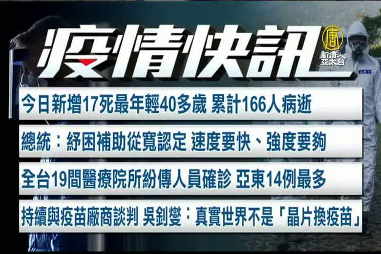 來看到今天的疫情快訊:今日新增17死,最年輕只有40多歲,共累計166人病逝。總統今天表示:紓困補助從寬認定,速度要快、強度要夠。全台19間醫療院所紛傳人員確診,亞東醫院14例最多。台灣持續與疫苗廠商談判,外交部長吳釗燮說︰真實世界不是「晶片換疫苗」。 //asset1.ntdtv.com.tw/public/uploads/assets/2021/06/03/2021-06-03-60b8c7315f3dc.mp4 紓困補助|疫苗|中共肺炎|武漢肺炎|疫情|防疫|中共病毒|新型冠狀病毒2021-06-03 20:11:06