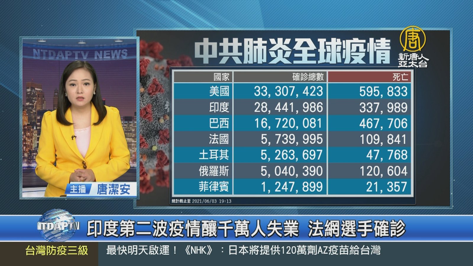 來關心中共肺炎疫情最新情況,全球確診超過1億7千170萬人,死亡3百69萬2千多人。但中共、伊朗等國家,被認為嚴重低報數據。亞洲方面,印度單日新增確診超過13萬4千例,死亡增加2千8百多人,印度第二波疫情,導致超過1000萬名印度勞工失業,而去年疫情爆發以來,至少97%的家庭收入下降。菲律賓新增7千2百多起確診。香港今天新增1例境外移入,連續9天零本土感染個案。南美洲的巴西,新增9萬5千多例確診,死亡增加2千5百多人。法國網球公開賽一組男子雙打,兩名參賽者都因確診被取消參賽資格,隔離中,不過主辦單位並未透 //asset2.ntdtv.com.tw/public/uploads/assets/2021/06/03/2021-06-03-60b8d6b9ee14c.mp4 印度|確診|香港|零確診|法網|巴西|菲律賓|中共肺炎|武漢肺炎|疫情|防疫|中共病毒|新型冠狀病毒2021-06-03 21:16:54