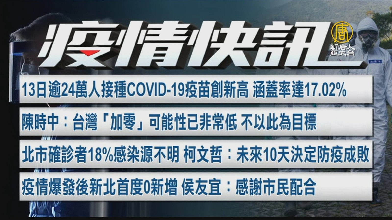 來看7月14日周三的疫情快訊。台灣昨天一天有超過24萬人接種COVID-19疫苗,創下新高,總涵蓋率達17.02%。台灣新增確診回到「加零」的可能性很低嗎?指揮官陳時中今天表示: 不以「加零」為目標。台北市確診者18%感染源不明,市長柯文哲說:未來10天決定防疫成敗。5月疫情爆發後,新北市首度0新增,市長侯友宜感謝市民配合。 //asset2.ntdtv.com.tw/public/uploads/assets/2021/07/14/2021-07-14-60eed5617f082.mp4 中共肺炎|武漢肺炎|疫情|防疫|中共病毒2021-07-14 20:12:41