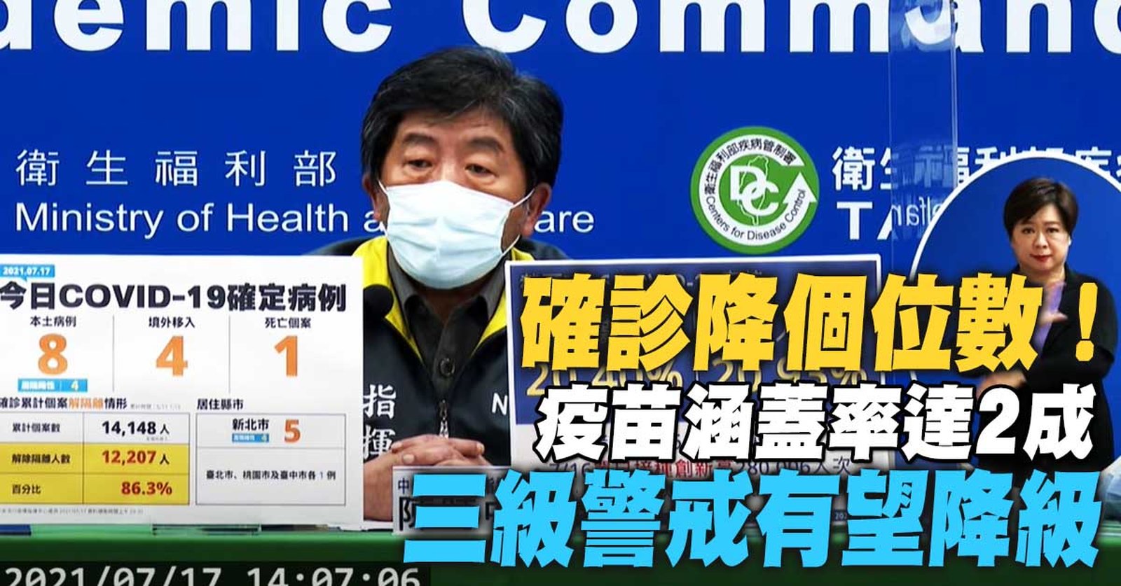 新聞一開始,馬上來看到,台灣抗疫有初步成果!全台實施三級警戒近兩個月來,台灣本土確診病例,首度回到個位數。疫情指揮中心指揮官陳時中表示,是個好消息,更表示7月26日降級的可能性很高,疫苗涵蓋率也突破2成,看到疫情控制的可能。 //asset2.ntdtv.com.tw/public/uploads/assets/2021/07/17/2021-07-17-60f2ca6ed3824.mp4 陳時中|確診|疫苗涵蓋率|降級2021-07-17 20:52:57