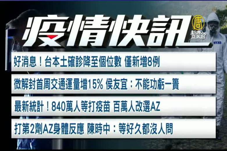 來看到7月17日的台灣疫情訊息。台灣三級警戒以來,本土確診個案首度降至個位數,僅新增8例。微解封首周交通運量增15%,侯友宜呼籲:做好防疫,不能功虧一簣。越來越多人更改疫苗接種意願!超過100萬人改施打AZ。陳時中親曝「打第2劑AZ」身體反應,只有舉手超過90度有點感覺,還笑稱:等好久都沒人問我。 //asset1.ntdtv.com.tw/public/uploads/assets/2021/07/17/2021-07-17-60f2d8dd77a71.mp4 微解封|本土確診|中共肺炎|武漢肺炎|疫情|防疫|中共病毒|新型冠狀病毒2021-07-17 21:19:25