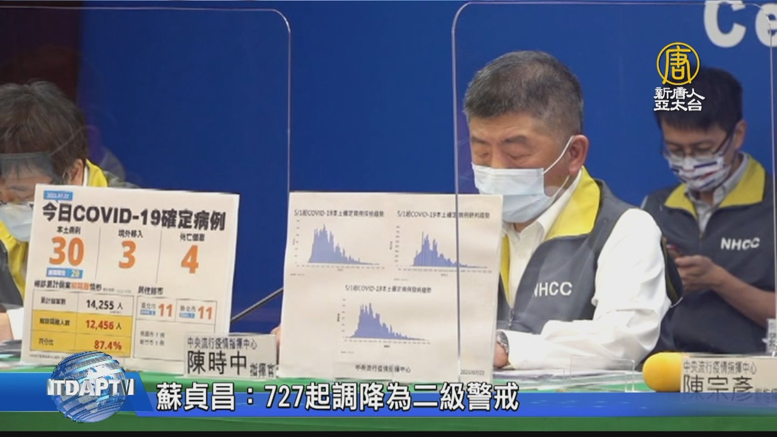 帶您來看到,台灣本土疫情稍緩,,今天(23日)新增的本土個案有23例,並且有18人已知感染源。不明感染源的個案持續1週都低於10人,防疫指揮官陳時中正式宣布,下週二起,全國降為二級警戒,地方可依疫情調整,但如果疫情升溫,也不排除隨時調整警戒等級。 //asset1.ntdtv.com.tw/public/uploads/assets/2021/07/23/2021-07-23-60fac3170e509.mp4 中共肺炎|防疫|疫情2021-07-23 21:24:39