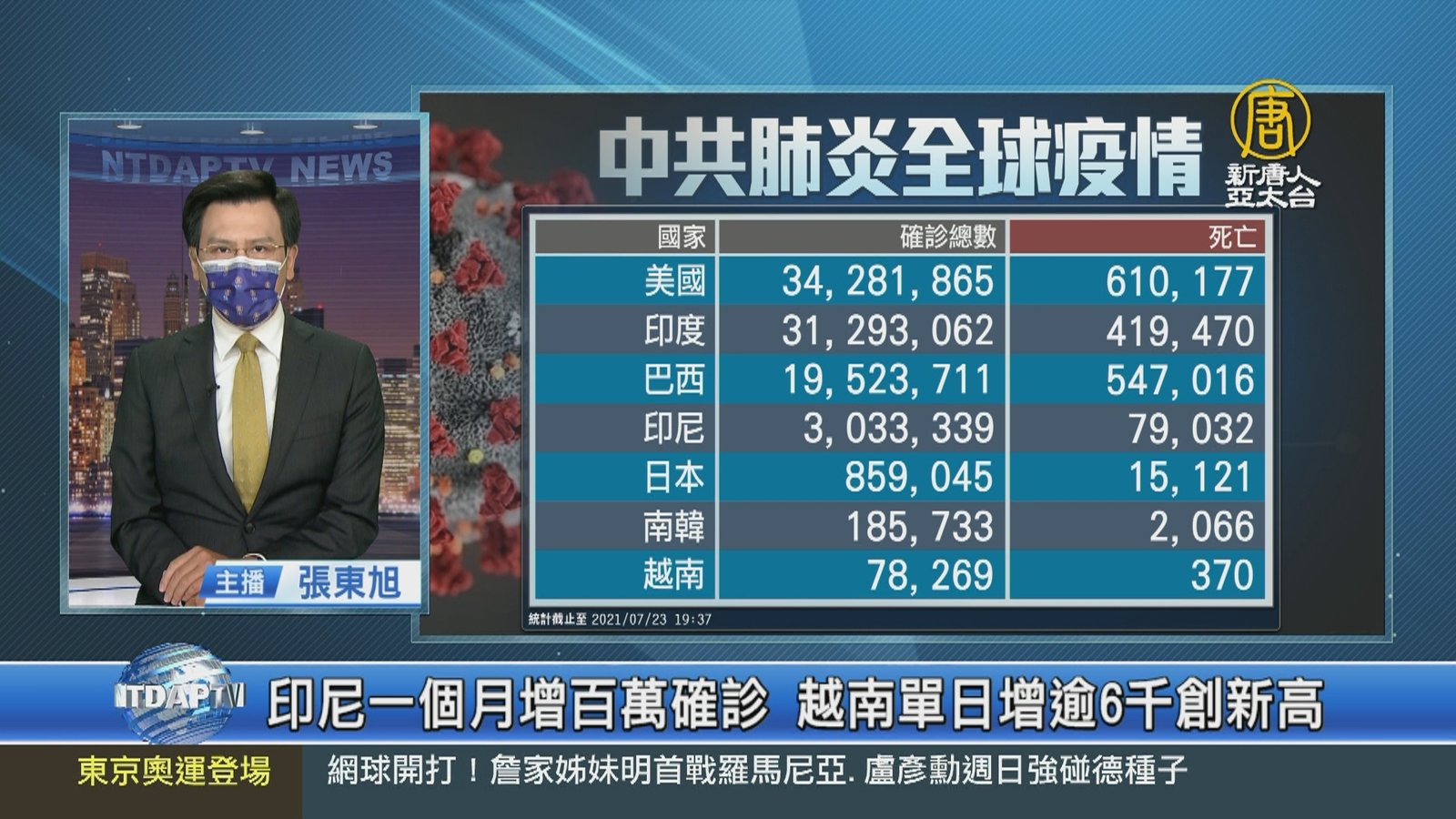 來關心中共肺炎疫情最新情況,全球確診超過1億9千259萬人,死亡4百13萬6千多人。但中共、伊朗等國家,被認為嚴重低報數據。亞洲方面,日本東京新增1千3百多例確診,連續4天超過1千人,東京奧運相關人士新增19例確診 包含3名選手。印尼新增1千4百多人死亡,再創單日新高,過去9天共累計超過1萬人染疫死亡,單日新增確診4萬9千多例,累計超過300萬例確診,僅僅約1個月的時間就增加1百萬例。南韓疫情持續蔓延,新增1630例確診,首都圈第4級社交距離規範延長實施2週。越南首度單日新增超過6千例確診,創下新高紀錄, //asset3.ntdtv.com.tw/public/uploads/assets/2021/07/23/2021-07-23-60fab62ece0d6.mp4 日本|東京|確診|印尼|南韓|越南|胡志明市|新加坡|中共肺炎|武漢肺炎|疫情|防疫|中共病毒|新型冠狀病毒2021-07-23 20:28:39