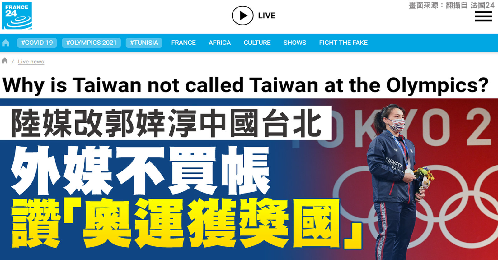 昨天,臺灣舉重選手郭婞淳,在奧運女子舉重59公斤量級,奪下金牌。中共官媒也報導了這個消息,不過,報導中卻把中華隊,叫做中國台北代表團。不過,爭議反倒讓台灣再一次被世界看見,許多外媒報導介紹,在地圖上根本找不到名為中華台北的國家,「到底拿下金牌的這個神秘組織是誰?」。 //asset3.ntdtv.com.tw/public/uploads/assets/2021/07/28/2021-07-28-61014b408f22b.mp4 郭婞淳|中國台北|中共|中國官媒|東奧|東京奧運2021-07-28 23:51:52