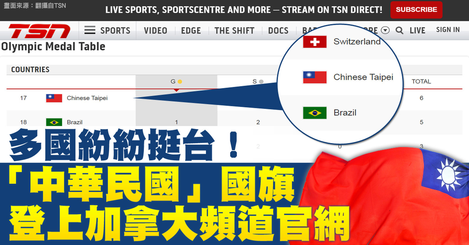 多國紛紛挺台! 「中華民國」國旗登上加拿大頻道官網