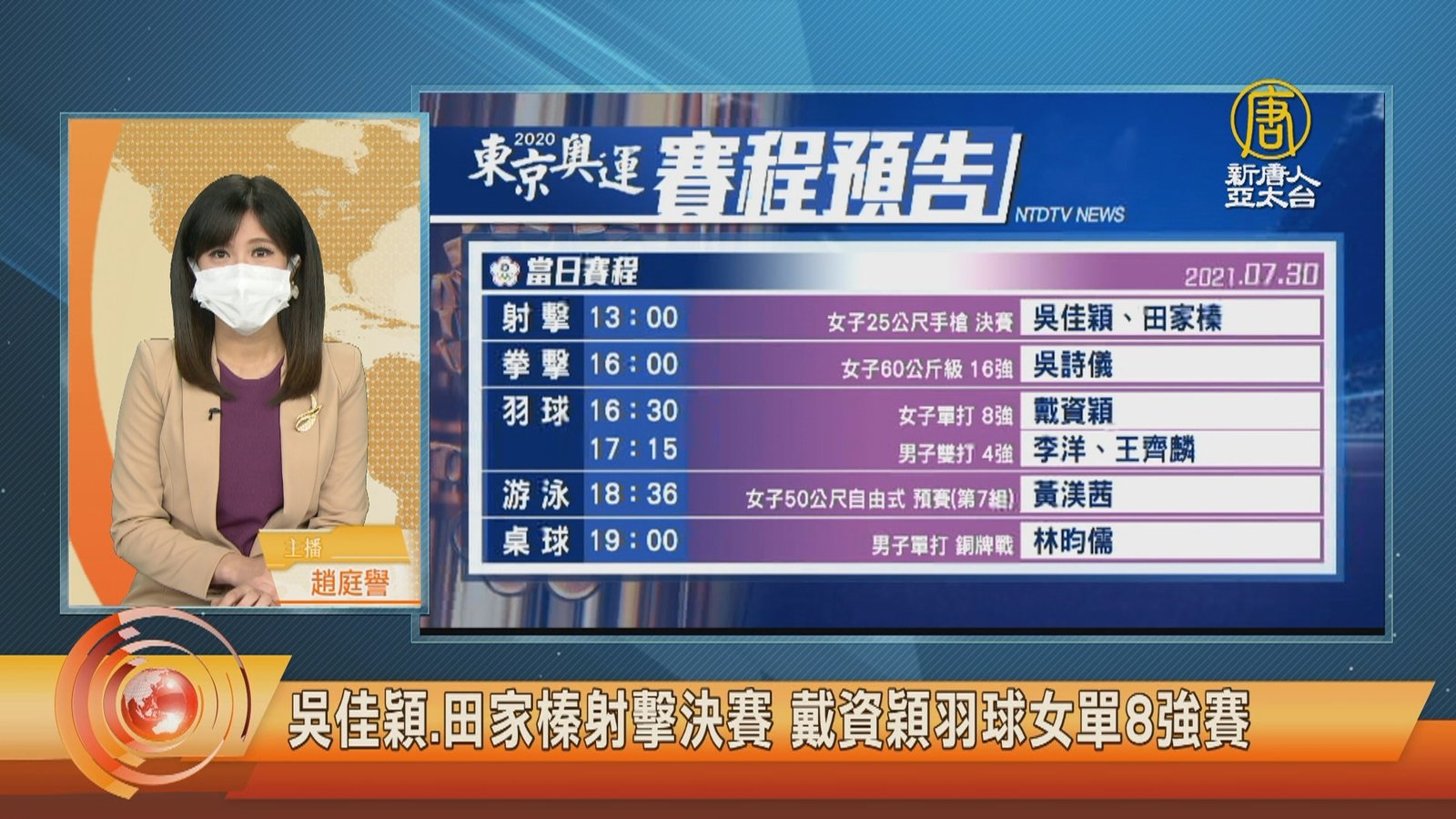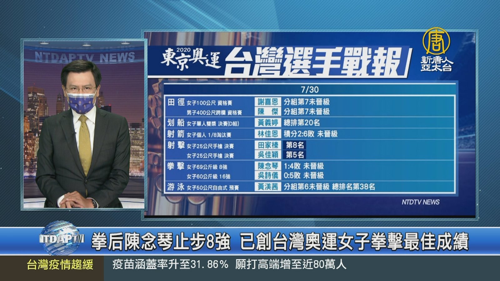 台灣田徑女將謝喜恩在女子100公尺預賽,分組第7未晉級。「跨欄王子」陳傑,分組第7名,無緣晉級。划船好手黃義婷,在單人雙槳,以總排第20名結束奧運賽事。射箭方面,女將林佳恩以積分2:6遭淘汰,無緣晉級8強。台灣好手田家榛及吳佳穎在女子25公尺手槍,雙雙取得決賽門票,最終田家榛以第8名作收,吳佳穎則是拿下第5名。拳擊項目,台灣女子拳擊好手陳念琴,以1比4落敗,止步8強。吳詩儀以0:5落敗,無緣晉級8強。游泳項目,台灣女將黃渼茜,在50公尺自由式預賽,分組第6,無緣晉級準決賽。 //asset3.ntdtv.com.tw/public/uploads/assets/2021/07/30/2021-07-30-6103ef2f1cdef.mp4 2021-07-30 20:20:42
