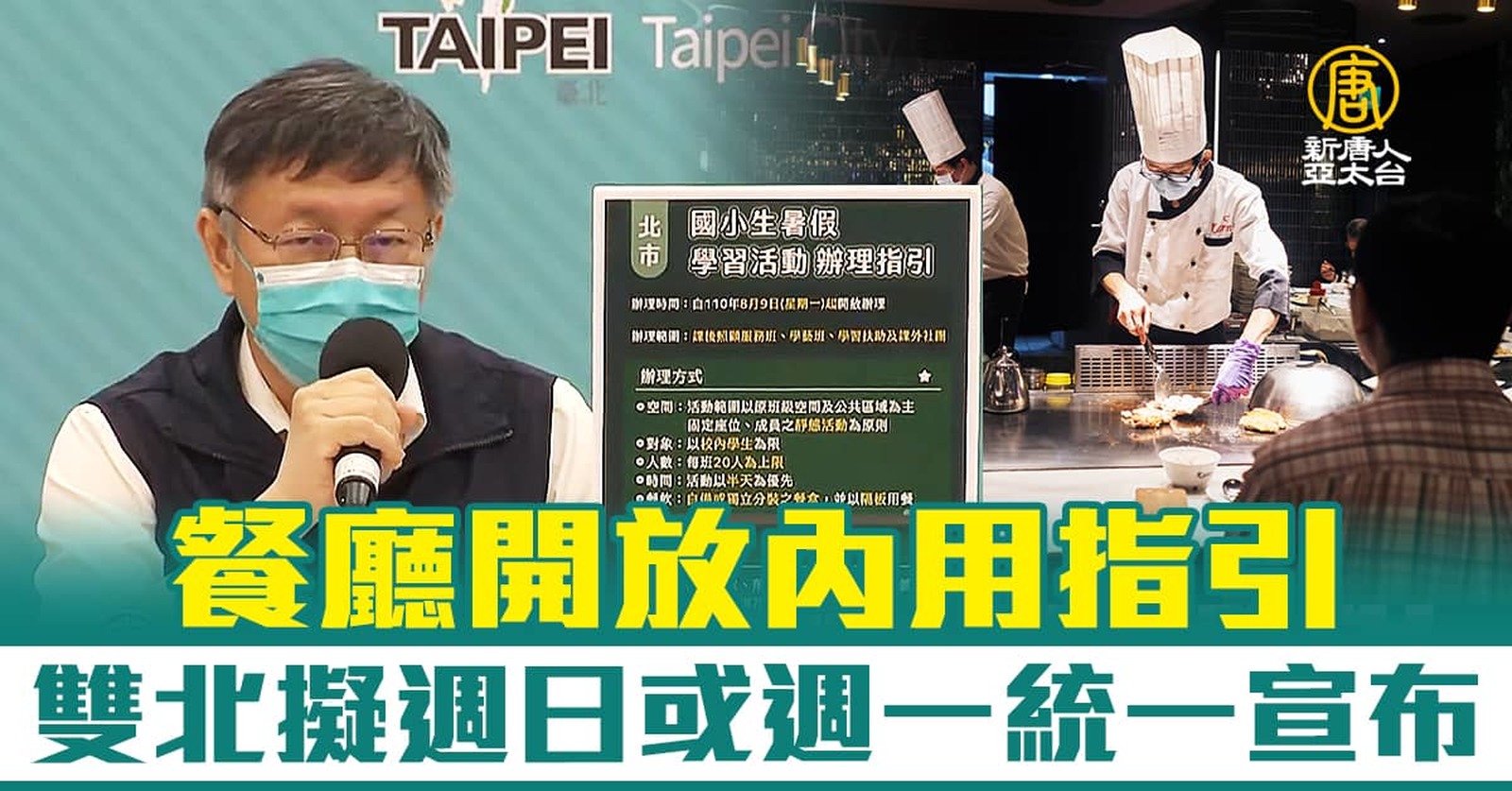 帶您來看到,今天台北市防疫記者會上,媒體關注,什麼時候 台北會宣布餐廳開放內用指引,對此,台北市長柯文哲是回應說,有跟新北市長侯友宜連絡過,對方認為要觀察解封後第一個周末的防疫情況,首都生活圈原則上會一起宣布。 //asset1.ntdtv.com.tw/public/uploads/assets/2021/07/30/2021-07-30-6103f2ab1b23f.mp4 中共肺炎|防疫|疫情2021-07-30 20:33:22