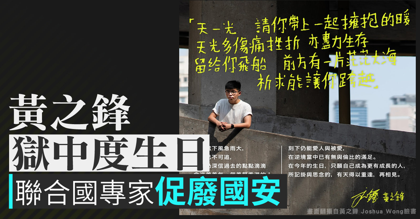 黃之鋒生日在獄謝港人 聯合國專家聯名促廢國安法