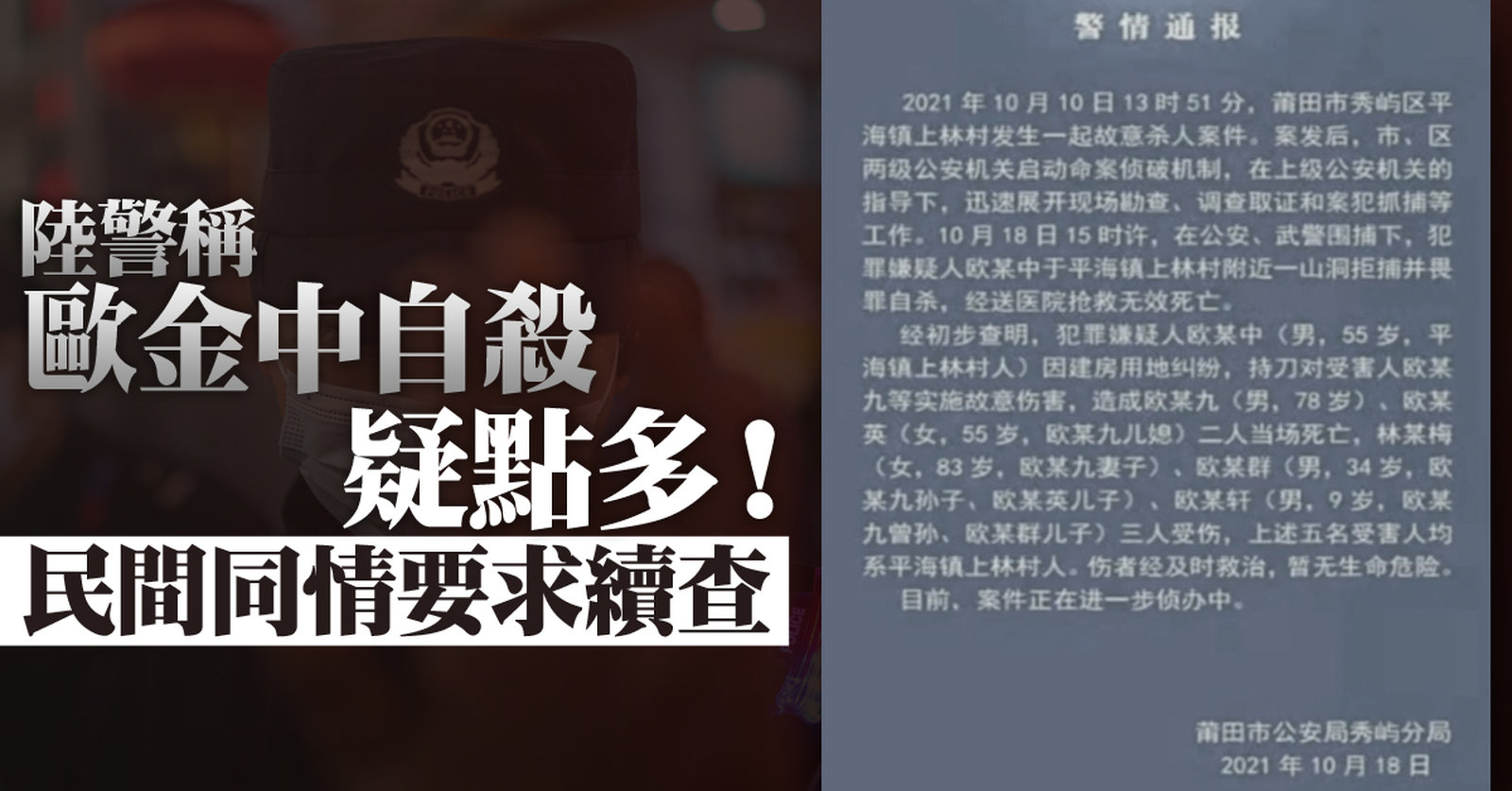 中國福建莆田2死3傷的命案,近來成為中國輿論關注焦點,,嫌犯歐金中疑似因多次向政府申訴蓋房糾紛卻得不到解決,引發了大量關注和同情,週一(10月18日),中共當局宣布歐金中畏罪自殺。消息迅速衝上了微博熱搜榜,網友不相信官方說法,超過1.8萬條評論,幾乎都在質疑警方說法。紛紛懷疑是警方直接擊斃,並留言要求警方公布執法影片。 //asset3.ntdtv.com.tw/public/uploads/assets/2021/10/19/2021-10-19-616ebf120eac3.mp4 福建|莆田命案|歐金中|被死亡|202110192021-10-19 22:09:26