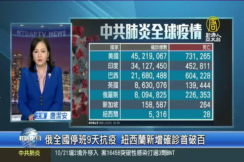 來關心中共肺炎疫情最新情況,全球確診超過2億4千206萬例,死亡4百92萬2千多人。但中共、伊朗等國家,被認為嚴重低報數據。亞洲方面,俄羅斯確診人數不斷攀升,已經連7天超過3萬例確診,總統普丁宣布,全國30日起停班9天。新加坡新增3千8百多例確診,死亡增加18例,是疫情爆發以來最高單日死亡紀錄,其中,半數都已完成疫苗接種。紐西蘭新增102起確診,單日確診首度破百例,創新高紀錄。歐洲方面,英國新增4萬9千多例確診,比上週上升了17%。愛爾蘭新增2千1百多例確診,儘管12歲以上的人口中有88%接種過疫苗,但過 //asset1.ntdtv.com.tw/public/uploads/assets/2021/10/21/2021-10-21-61715e3fbcef5.mp4 俄羅斯|死亡|確診|新加坡|紐西蘭|英國|愛爾蘭|疫情|防疫|中共病毒|202110212021-10-21 21:56:04
