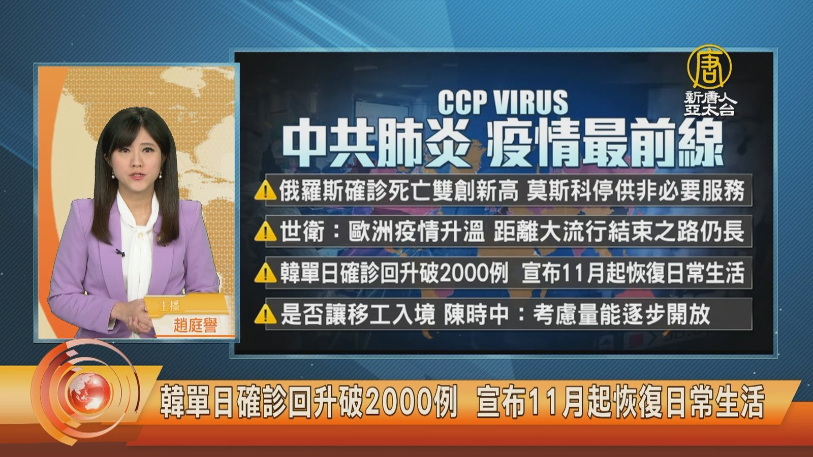 歡迎回來,來關心中共肺炎疫情最新情況,全球確診超過2億4千556萬例,死亡4百98萬2千多人。但中共、伊朗等政權,被認為嚴重低報數據。世界衛生組織指出,歐洲疫情惡化,導致全球確診數2個月以來再次上升,比前一週增加4%,單以歐洲來看則激增18%。俄羅斯新增確診3萬9千多例、死亡增加1千163例,再創新高,過去11天中單日新增死亡數已經9度刷新紀錄,首都莫斯科封城11天。烏克蘭新增2萬6千多例確診,創單日新高。德國28日創下兩週以來最大增幅,新增確診超過2萬8千人。東南亞的新加坡,新增確診3千4百多例,並發現 //asset3.ntdtv.com.tw/public/uploads/assets/2021/10/29/2021-10-29-617beeedcb320.mp4 俄羅斯|死亡|確診|水行俠|傑森摩莫亞|莫斯科|封城|歐洲|新加坡|烏克蘭|德國|丹麥|疫情|防疫|中共病毒|202110292021-10-29 22:12:08