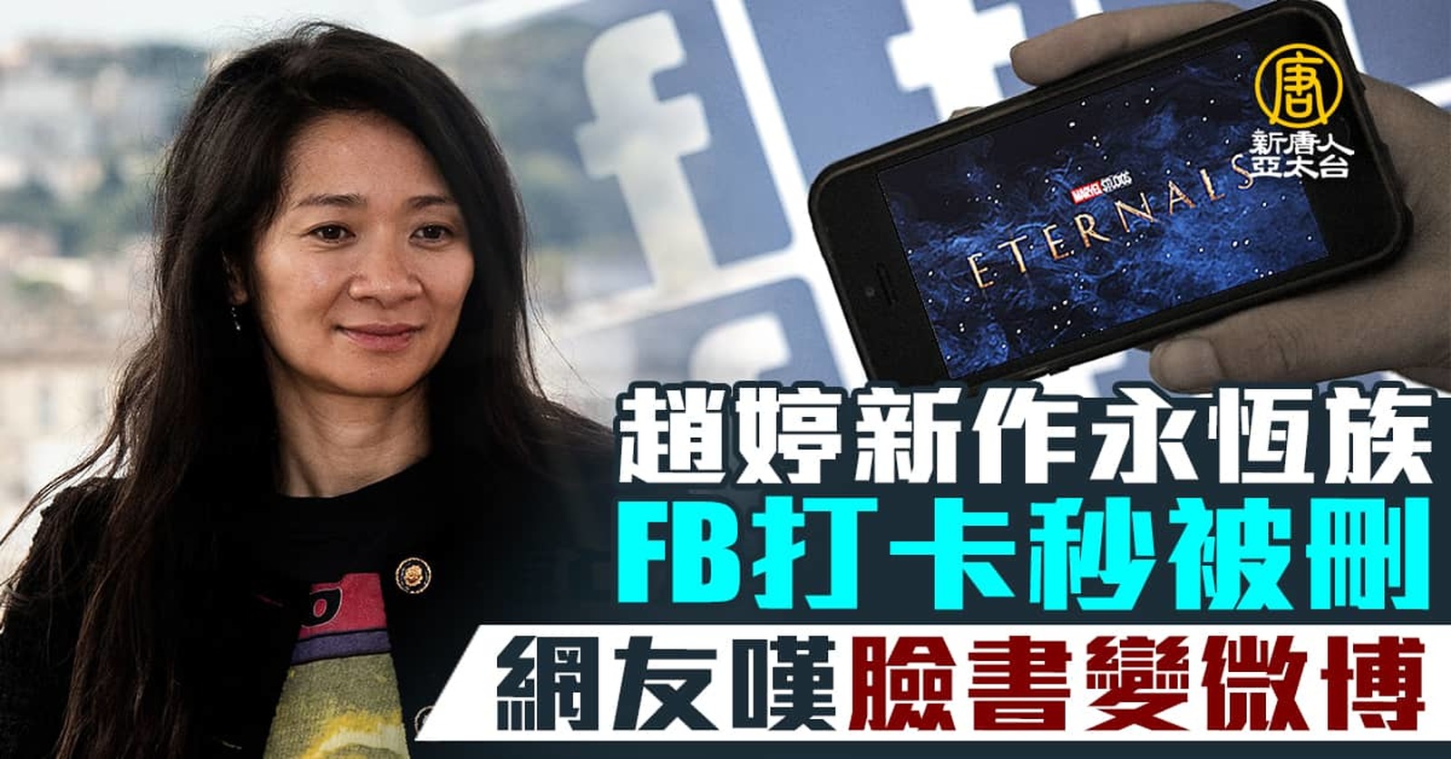 漫威電影《永恆族》在全台上映一周票房賣破1.3億元,成績亮眼,不過卻有許多網友反應,在Facebook打卡電影英文片名「Eternals」,貼文竟然會遭系統秒刪除。記者實際測試,在臉書貼文點選活動以及觀看電影選項,並打卡標註《永恆族》的電影英文名稱「Eternals」發布,重新整理後不到一秒,文章直接就被刪除下架。拍攝《永恆族》的華裔導演趙婷,曾批評出生地中國充滿謊言,因此被貼上辱華標籤後遭中共封殺。PTT有網友評論,終於臉書要變成微博了、幫祖國對付趙婷?也有美國網友推測臉書應該是將《永恆族》「Etern //asset1.ntdtv.com.tw/public/uploads/assets/2021/11/09/2021-11-09-618a75c5e6c82.mp4 永恆族|Eternals|趙婷|漫威|臉書|Facebook|自我審查|202111092021-11-09 22:15:54
