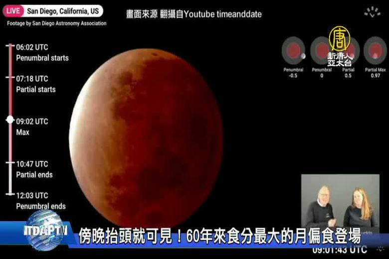 今年壓軸的月偏食傍晚登場!今天正值黃曆十五、滿月,傍晚出現1939年以來,食分最大的月偏食。中央氣象局官方臉書粉專說,這次月偏食,最大覆蓋率接近98%,非常接近全食的程度;而且還是「月出帶食」,就是在月亮剛出來的時候,就是月亮被吃掉最多的時候,17:03分月升之時,血月漸退、至18時47分月亮復圓,其間共歷時1小時44分。而在美國觀看到的月食,預估更將長達3小時28分鐘,也將是北美近600年來持續時間最長的一次月偏食。整個北美洲地區,以及南美洲、澳洲及東北亞部分地區民眾,都將能見證這場奇觀。 //asset1.ntdtv.com.tw/public/uploads/assets/2021/11/19/2021-11-19-61979a659bf65.mp4 中央氣象局|月偏食|月出帶食|202111192021-11-19 22:24:29