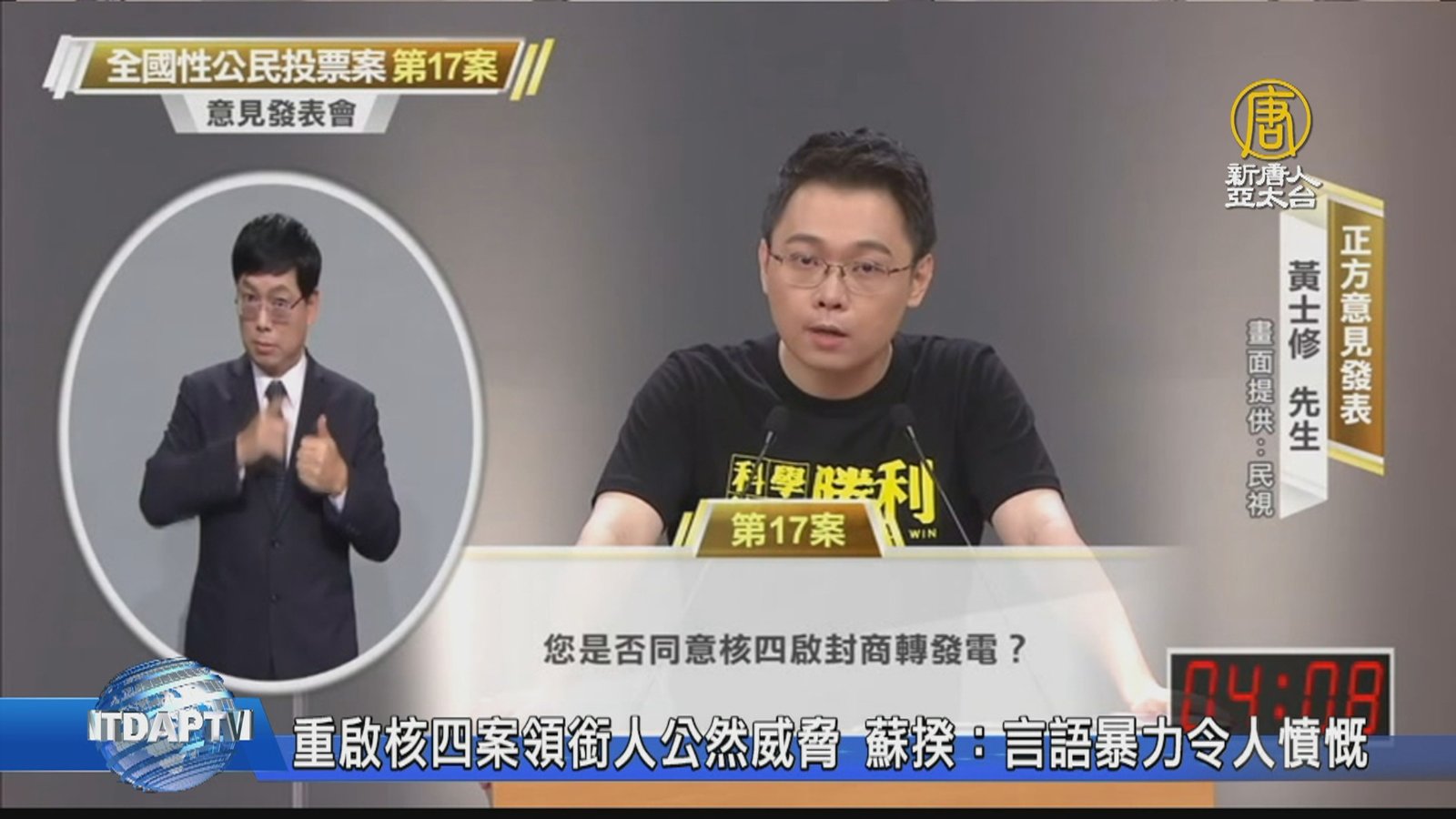 政治話題來看到,昨天(18日)中選會舉辦的第二場公投政策說明會,在「重啟核四」一案的部分,是由此案公投領銜人黃士修,及台電核能處長許永輝進行政策說明。不過,黃士修卻先出言威脅許永輝要小心說話,如果宣稱核四廠有什麼問題,就要告發對方。甚至詢問許永輝「身家安頓好了嗎」。公然出口威脅的行為,引起各界譁然。對此,行政院長蘇貞昌表達譴責,也交代經濟部長,對於後續許處長面臨的法律問題,要全力協助。 //asset3.ntdtv.com.tw/public/uploads/assets/2021/11/19/2021-11-19-6197981ce31e3.mp4 公投|黃士修|重啟核四|威脅|恐嚇|蘇貞昌|朱立倫|202111192021-11-19 22:22:52