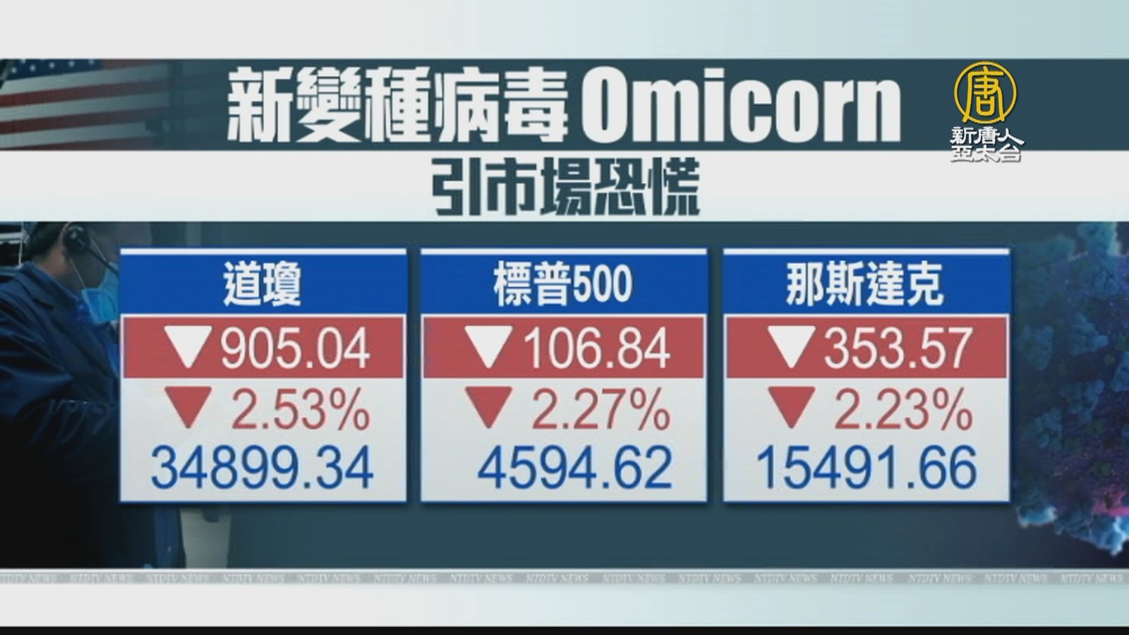好,來關心股市,新變種株「Omicron」近日現蹤南非,專家警告傳染力恐高於其他變異株,讓全球市場避險情緒升溫。26日黑色星期五這天,美股開盤道瓊指數暴跌超過900點,原本已經呈現復甦跡象的航空旅遊市場,相關股票也大受打擊。 //asset2.ntdtv.com.tw/public/uploads/assets/2021/11/27/2021-11-27-61a226280e1c9.mp4 南非|新變種病毒|Omicorn|華爾街|股市|通膨2021-11-27 20:32:20