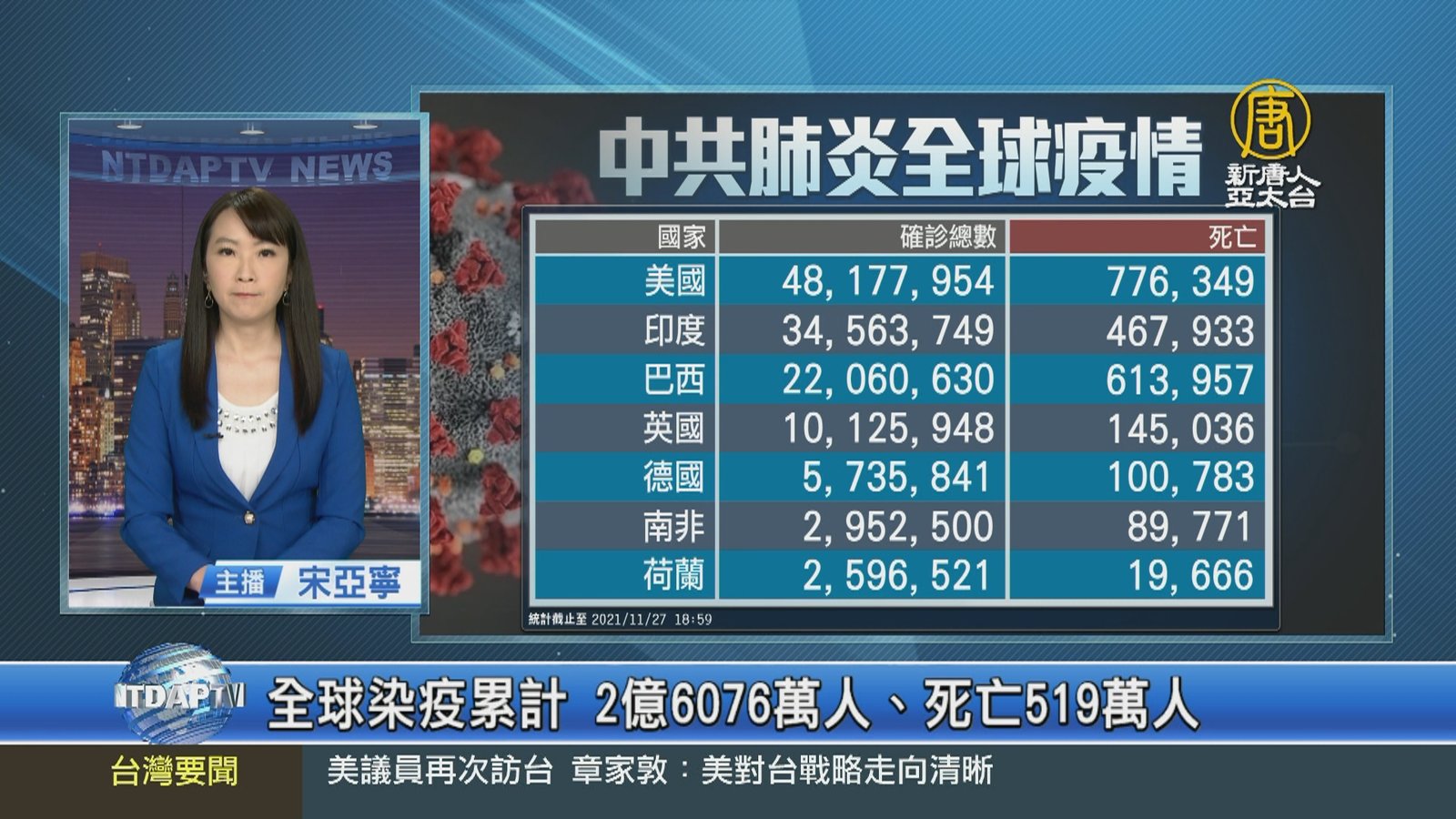 歡迎回來,再來關心中共肺炎動態,目前全球公開數據,累計確診 2億6千零76萬人,累計死亡 519萬人。其中,中共、伊朗等國家,被認為嚴重低報數據。美國目前累計 4千8百17萬人確診,死亡77.6萬人。英國新增確診 5萬零91例,是10月21日以來最多。德國新增確診 7.6萬例、死亡357人,單日確診再創新高。世衛組織將南非新發現的 Omicron變異株,列為「高關注變異株」。南非目前累計 295萬人確診,死亡 8.9萬人。26日南非飛抵荷蘭阿姆斯特丹的兩個航班,已檢測出61人確診,是否感染 Omicron //asset3.ntdtv.com.tw/public/uploads/assets/2021/11/27/2021-11-27-61a22864059d2.mp4 英國|德國|南非|荷蘭|美國|中共病毒|武漢肺炎2021-11-27 20:43:12