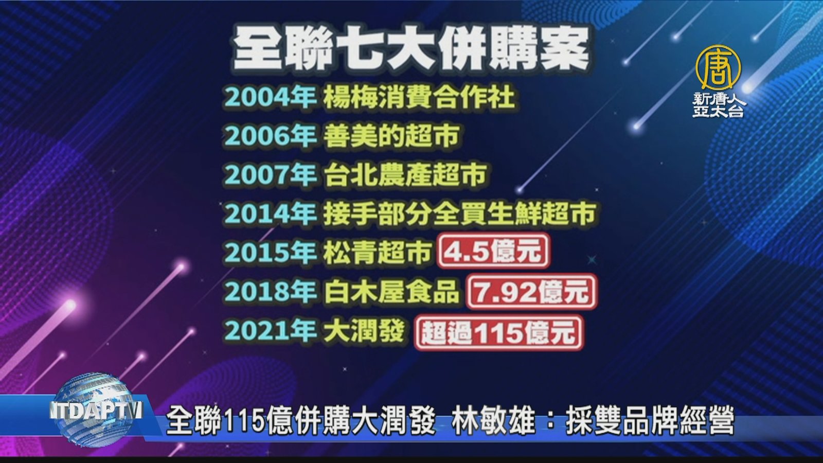 國內超市龍頭全聯,今天(11月27日)舉行公益活動,董事長林敏雄也親自出席,感謝第一線防疫英雄們在疫情期間的付出,也透露全聯收購大潤發總金額不如外界說的那麼高,「大約115億元!」,而被問到會不會再買家樂福?林敏雄說,「目前沒有去評估,怕社會觀感不好 。」 //asset2.ntdtv.com.tw/public/uploads/assets/2021/11/27/2021-11-27-61a22d635fc69.mp4 物價|超市|賣場|林敏雄|全聯|大潤發2021-11-27 21:04:04