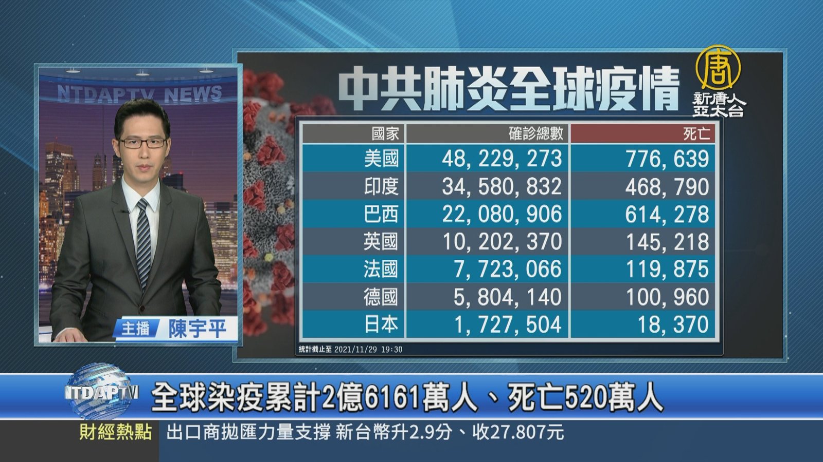 新聞首先來關心,中共肺炎動態,目前全球公開數據,累計確診 2億6千1百61萬人,累計死亡 520萬人。其中,中共、伊朗等國家,被認為嚴重低報數據。而新變種病毒 Omicron引發全球恐慌,已知 14國出現蹤跡,另外法國、日本也都出現非洲南部入境的確診者,正在確認是否感染 Omicron。 //asset1.ntdtv.com.tw/public/uploads/assets/2021/11/29/2021-11-29-61a4c3d00f6a4.mp4 英國|德國|法國|日本|美國|中共病毒|武漢肺炎|Omicron|202111292021-11-29 22:15:10