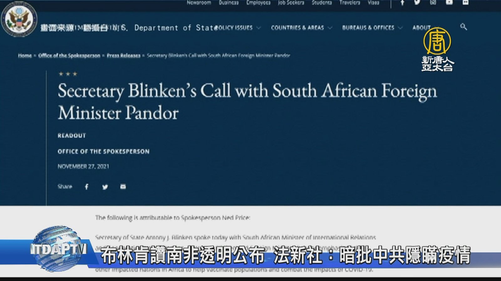 再來看到,相較兩年前的武漢病毒株,美國這次稱讚南非展現透明度,被認為是在暗批中共。27號,美國國務卿布林肯與南非外交部長潘道爾進行對談。事後,國務院發布聲明,特別稱讚南非科學家快速識別出Omicron變種病毒,南非政府也展現出透明度,將變種病毒的消息與世界分享,堪稱世界典範。對此,法新社指出,國務院的聲明,相當於是在抨擊中共當初隱瞞疫情的行徑。 //asset1.ntdtv.com.tw/public/uploads/assets/2021/11/29/2021-11-29-61a4c53a6f499.mp4 中共病毒|Omicron|南非|布林肯|中共|隱瞞疫情|202111292021-11-29 22:18:16