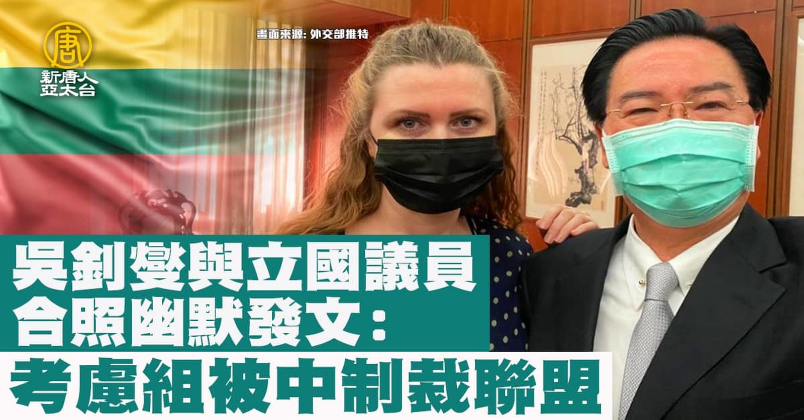 好,波海三國的國會議員組團來訪台灣,下午,也與外交部長吳釗燮見面。吳釗燮在外交部的推特上,發出與立陶宛國會議員 薩卡利埃內的合照,並幽默表示,她是被中國共產黨制裁的受害者,正考慮組成一個「被中國制裁者聯盟」,來擴大國際間的合作,對抗威權主義,保護自由與民主。 //asset1.ntdtv.com.tw/public/uploads/assets/2021/11/29/2021-11-29-61a4d395b982a.mp4 波羅的海三國|立陶宛|拉脫維亞|愛沙尼亞|民主自由|被中國制裁者聯盟|202111292021-11-29 22:19:32