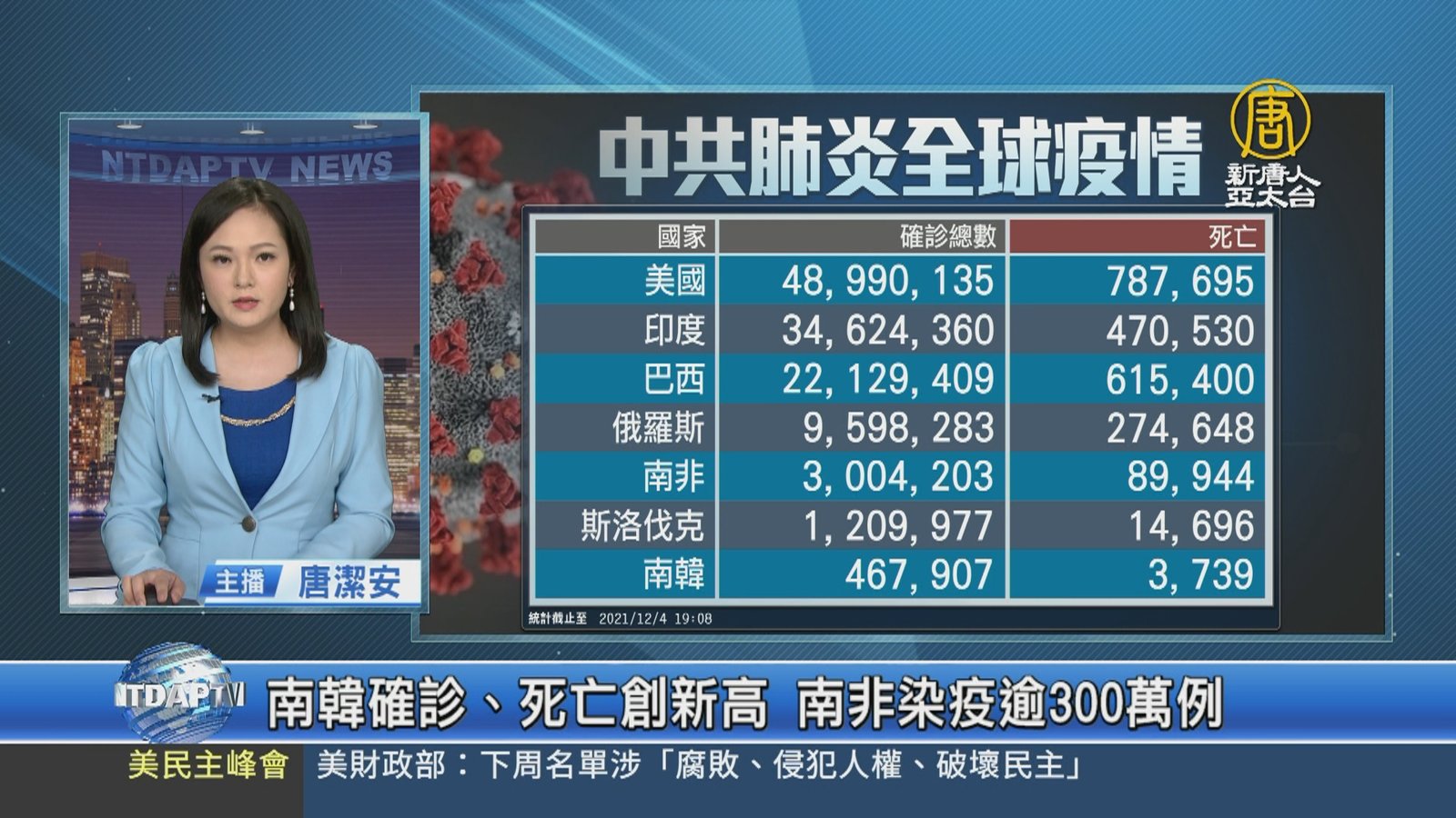 來看到疫情最新數據,全球確診超過2億6千497萬例,死亡5百24萬4千多人。但中共、伊朗等政權,被認為嚴重低報數據。歐洲確診病例突破7千5百萬人,2021下半年歐洲單日新增最多出現過35萬9千例,疫情傳播還比上半年更快。俄羅斯聯邦統計局公布,10月有近7萬5千人染疫死亡,是疫情以來俄羅斯最致命的月份。亞洲的南韓新增5千3百多起確診,死亡增加70人,雙雙刷新單日新增最高紀錄,現有重症患者752例,同樣創下最高紀錄。 //asset1.ntdtv.com.tw/public/uploads/assets/2021/12/04/2021-12-04-61ab5cb15372a.mp4 歐洲|確診|南韓|俄羅斯|斯洛伐克|中共病毒|202112042021-12-04 20:58:33