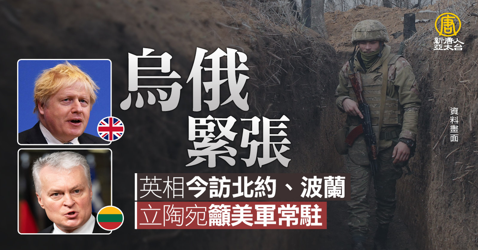 國際焦點,來關心,為了解決烏克蘭和俄羅斯的緊張局勢,多個國家採取行動。今天(10日),英國首相強生將訪問北約總部,與北約秘書長史托騰伯格會談。並將到訪波蘭,會晤波蘭總理和總統,訪問駐紮在波蘭的英國士兵。另外,立陶宛總統瑙塞達也在9號表示,將要求輪派美軍能常駐立陶宛,強化區域安全。同一天,美國軍隊也從德國遷往羅馬尼亞,並向位在烏克蘭東部、靠近黑海的美軍基地運送增援部隊,強化東歐防禦。 //asset1.ntdtv.com.tw/public/uploads/assets/2022/02/10/2022-02-10-62050b9b6de8c.mp4 烏克蘭|強生|立陶宛|北約|202202102022-02-22 19:52:14
