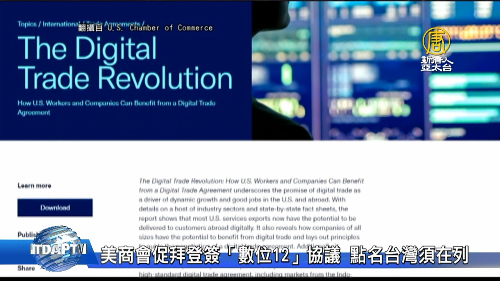 外媒報導,為制衡中共在印太區域日漸增強的影響力,拜登政府即將在數周內公布「印太經濟架構」,對此,台灣外交部發言人歐江安今天在例行記者會表示,支持美方積極強化與印太國家經貿關係,將持續深化台美在供應鏈韌性、基礎建設等多元議題合作。另外,美國商會週三釋出最新報告,力促拜登政府應與理念相近的國家協商洽簽署數位貿易協議,以確保攸關包括數據跨境流通等議題獲得保障,並提出美國可談判洽簽該協議的一群好夥伴國家「數位12」,並直接點名台灣加入。 //asset2.ntdtv.com.tw/public/uploads/assets/2022/02/10/2022-02-10-6205107e63b27.mp4 印太經濟架構|美國商會|數位貿易協議|數據跨境流通|數位12|台灣|202202102022-02-10 23:03:31