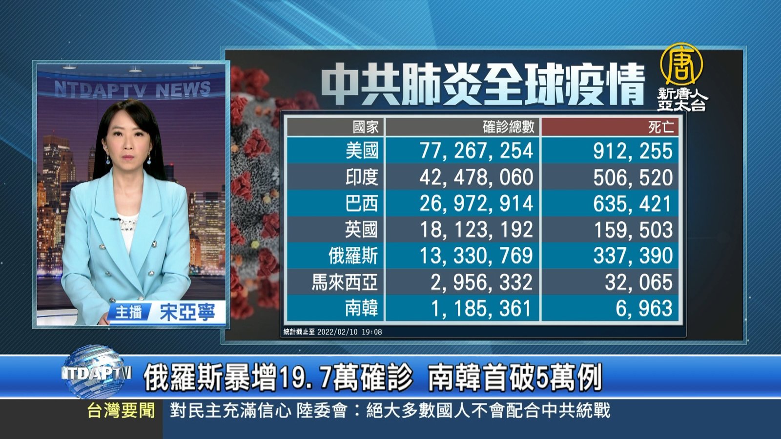 來關心中共肺炎疫情最新情況,全球確診超過4億零3百27萬例,死亡5百77萬8千多人。但中共、伊朗等政權,被認為嚴重低報數據。亞洲方面,南韓新增5萬4千多例確診,是疫情爆發以來首次超過5萬例,已經接種2劑疫苗的《Running Man》成員金鍾國也證實確診。香港繼昨天超過千人確診後,今天(10日)再新增9百86例確診,另外還有至少3百起初步確診案例。馬來西亞面臨Omicron疫情,9日新增1萬7千多例確診,創下今年以來的新高,連續4天單日新增都破萬。歐洲部分,俄羅新增確診19萬7千多例,再度刷新昨天的單日紀 //asset2.ntdtv.com.tw/public/uploads/assets/2022/02/10/2022-02-10-620504c5e2d6b.mp4 Omicron|確診|金鍾國|南韓|香港|俄羅斯|丹麥女王|西班牙國王|中共病毒|202202102022-02-10 23:06:11