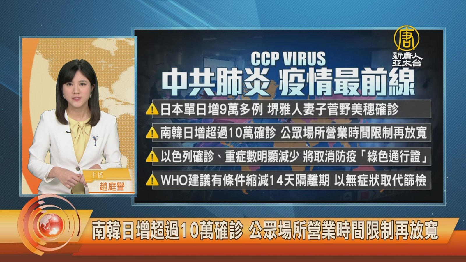 今天的疫情透視,請到前北榮感染科主治醫師鄭元瑜。歐美澳國家相繼解除防疫措施,開放國門,不過在亞洲,日本、南韓都單日新增超過九萬例確診,不過日本已決定三月放寬商務客入境,縮短隔離天數至三天。請教鄭醫師怎麼看國際疫情走向?當國際機構紛紛警告,中港強制清零政策衝擊經濟,台灣下一張防疫試卷應該怎麼寫? //asset2.ntdtv.com.tw/public/uploads/assets/2022/02/18/2022-02-18-620f9dd9c4a96.mp4 中共病毒|國際疫情|Omicron|鄭元瑜|防疫管制|202202182022-02-18 22:42:34