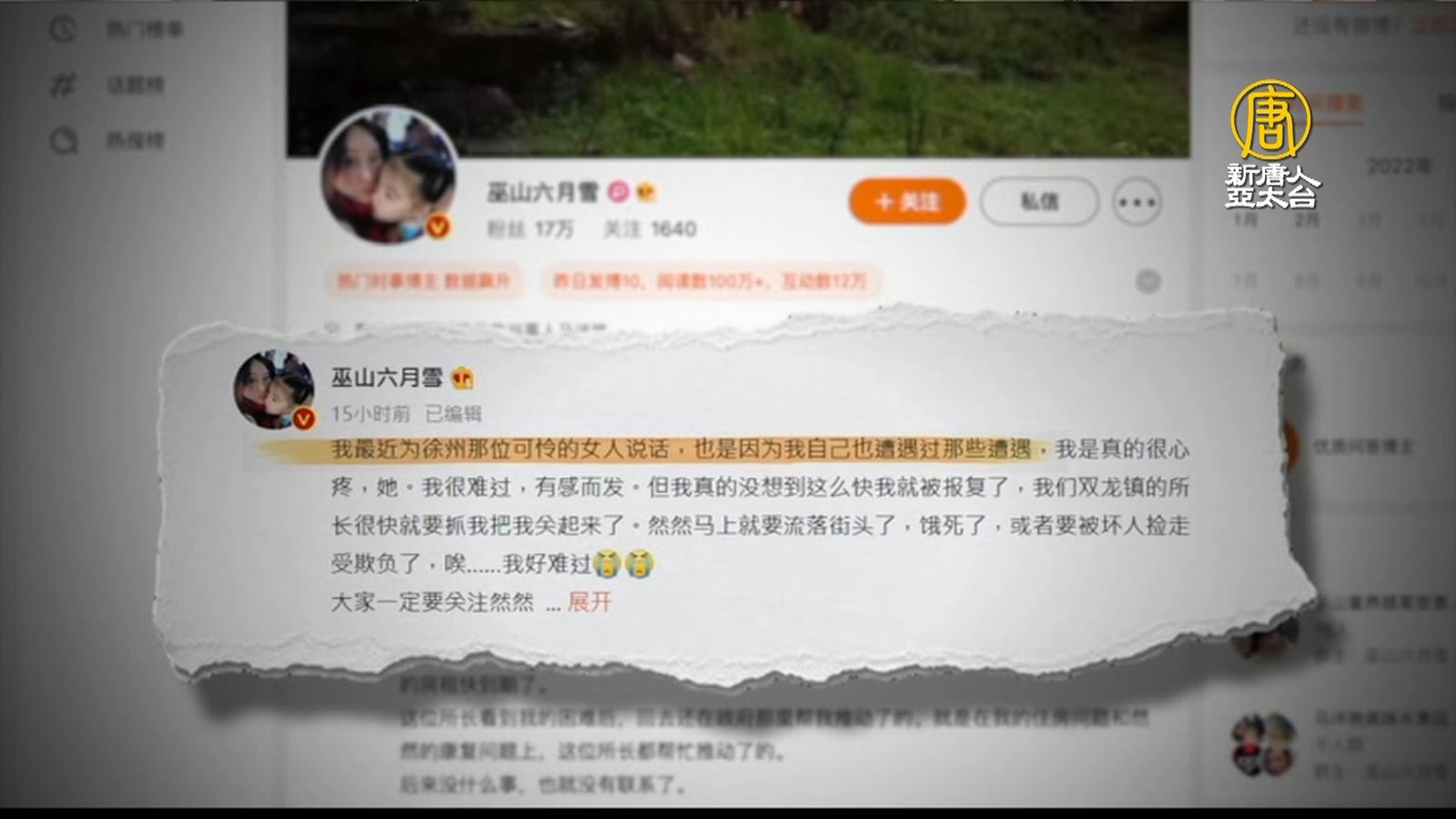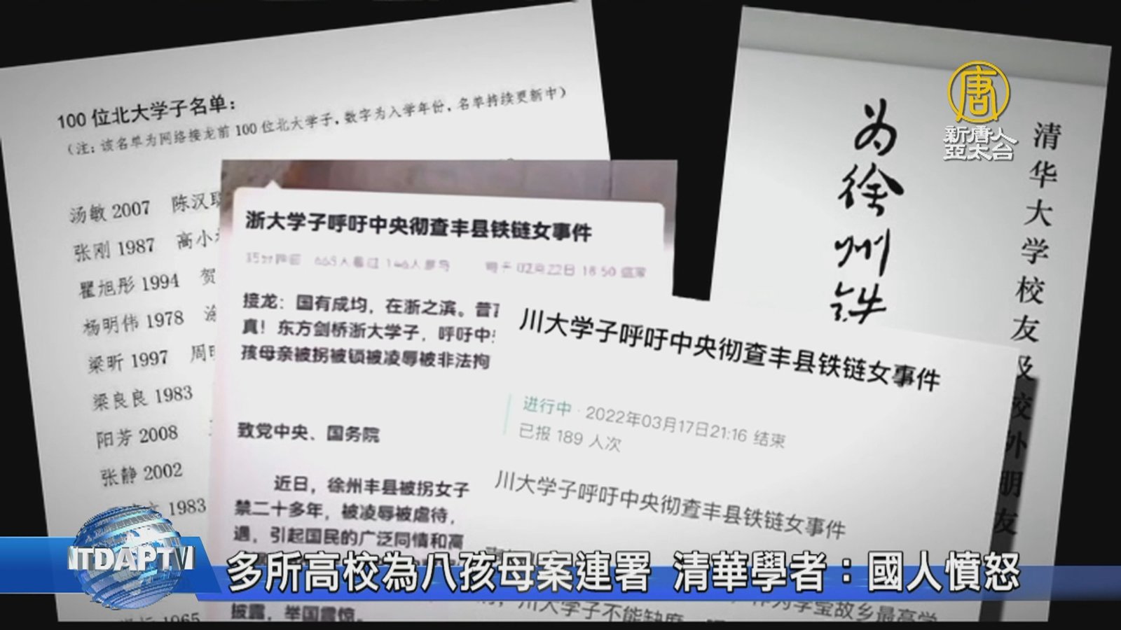 徐州豐縣八孩鐵鏈母事件持續發燒,中國大陸媒體人和網民挖出更多疑點。有網民整理公開報導發現,徐州頻繁發生婦女非正常死亡命案。跟徐州鐵鏈女有相同悲慘遭遇的重慶人方思月,最近因為聲援鐵鏈女,收到雙龍鎮派出所的傳喚證,她透露當年兩次逃脫、向派出所報警,警方卻都不管。 //asset2.ntdtv.com.tw/public/uploads/assets/2022/02/18/2022-02-18-620f9792cb41a.mp4 中國|人口拐賣|婦女兒童失蹤|李瑩|八孩母|徐州|鐵鍊女|重慶|方思月|202202182022-02-18 22:44:56