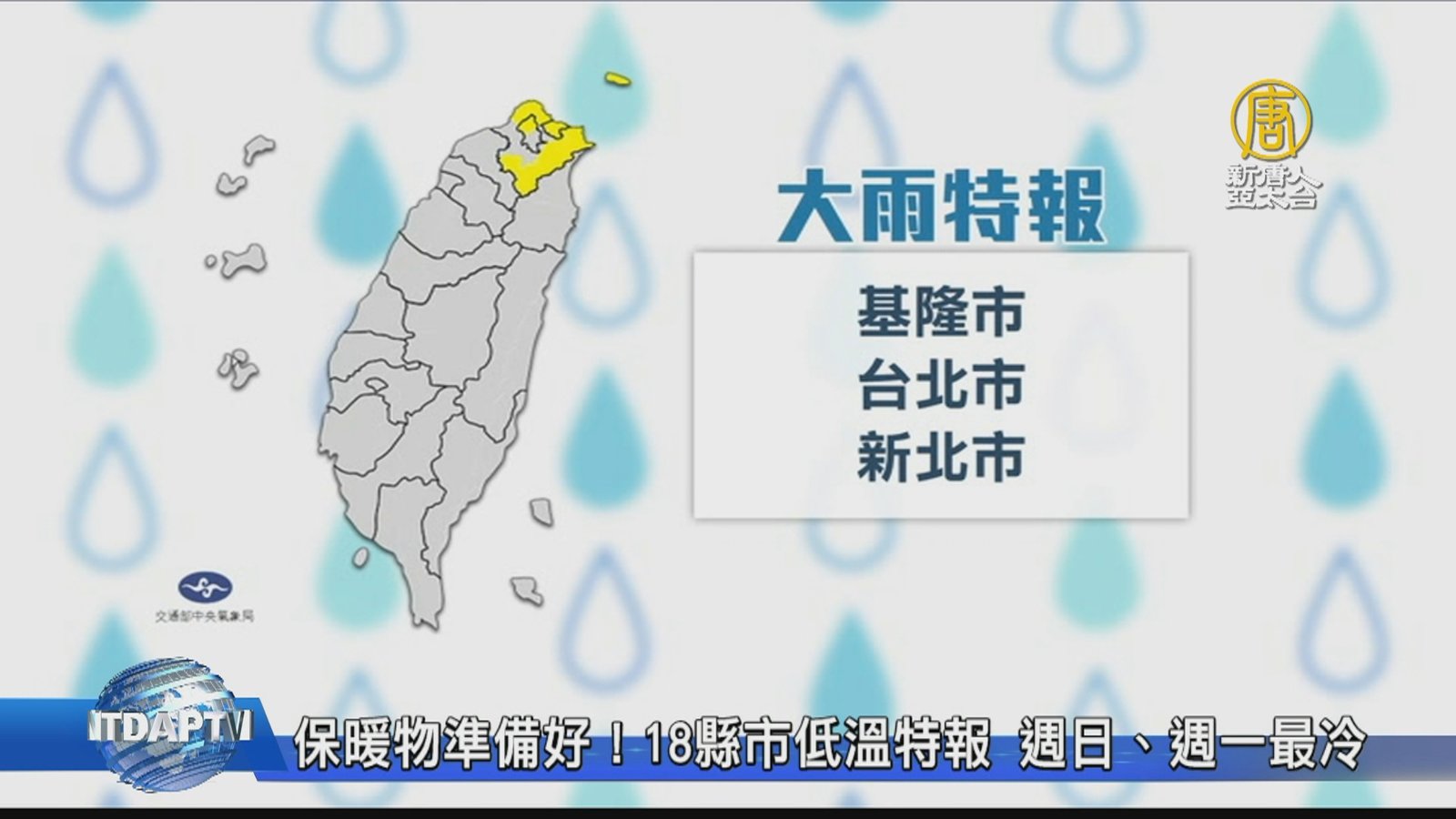 新聞首先來關心天氣,今年首波寒流影響台灣!今天(19日)下午開始,全台各地低溫將可能降到10度以下,氣象局針對全台18個縣市發佈低溫特報,基隆市、雙北地區則發佈大雨特報,最低溫將出現在明天到下週一(21日)清晨,北台灣下探10度,寒流加上水氣充沛,2500公尺以上的高山有降雪機會。 //asset3.ntdtv.com.tw/public/uploads/assets/2022/02/19/2022-02-19-6210e03401bf0.mp4 寒流|氣象|大雨特報|天氣預報|低溫|氣象局|202202192022-02-19 21:16:52