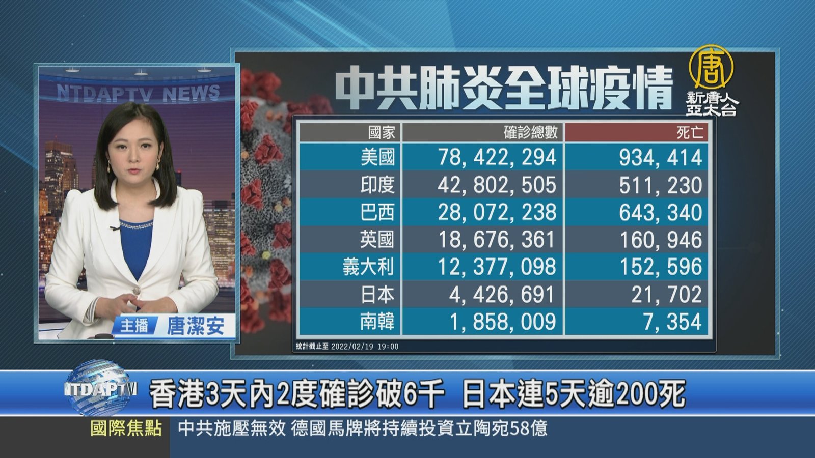 再來關心中共肺炎動態,目前全球公開數據,累計確診4億2千163萬人,累計死亡587萬人。其中,中共、伊朗等國家,被認為嚴重低報數據。美國累計確診7千8百42萬人,死亡93.4萬人;印度累計確診4千2百80萬人,死亡51.1萬人;巴西新增確診12.1萬人、英國新增確診4.7萬人、義大利新增確診5.3萬人、日本新增確診8.1萬人、死亡219人,日本連續5天超過200人死亡。另外,南韓已連續兩天,新增確診超過10萬人,單日確診數是兩周前的2.8倍。香港疫情嚴峻,新增確診6千多例,過去3天內兩度超過6千例。 //asset2.ntdtv.com.tw/public/uploads/assets/2022/02/19/2022-02-19-6210e4c66ebce.mp4 美國|印度|英國|南韓|日本|中共病毒|202202192022-02-19 21:23:11