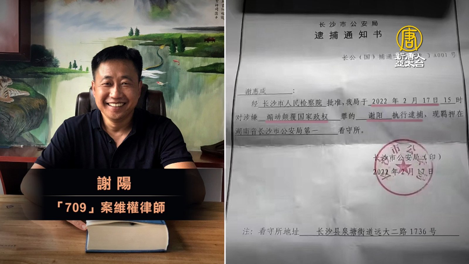 中國「709」案維權律師謝陽2月17號被當局以「涉嫌煽動顛覆國家政權罪」正式逮捕。謝陽的朋友表示,謝陽一直在為社會公平和正義奔走呼喊,因而得罪當局,被構陷入獄。 //asset1.ntdtv.com.tw/public/uploads/assets/2022/02/22/2022-02-22-6214e8dc11eb0.mp4 709|維權律師|謝陽|709大抓捕|中共迫害|煽動顛覆國家政權罪|202202222022-02-22 22:12:14