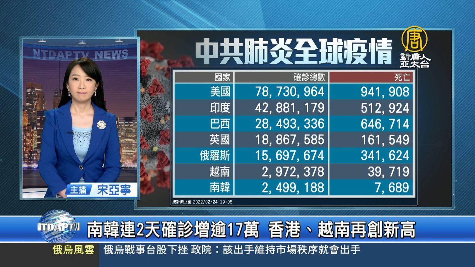繼續來關心中共肺炎疫情最新情況,全球確診超過4億2千9百88萬例,死亡5百91萬8千多人。但中共、伊朗、北韓等政權,被認為嚴重低報數據。亞洲方面,南韓單日新增確診連續兩天超過17萬例,男星朴敘俊與全能女團「MAMAMOO」的隊長頌樂確診,兩人先前都已經完成3劑疫苗的接種。香港新增將近8千8百例確診,連續第二天破8千例,再創單日新高紀錄,至少有近半患者疑似感染Omicron變異株,另有50人因染疫死亡。越南新增6萬多例確診,再度刷新疫情爆發以來的紀錄。 //asset1.ntdtv.com.tw/public/uploads/assets/2022/02/24/2022-02-24-62177b00b20f8.mp4 香港|確診|南韓|越南|中共病毒|Omicron|202202242022-02-24 22:11:22