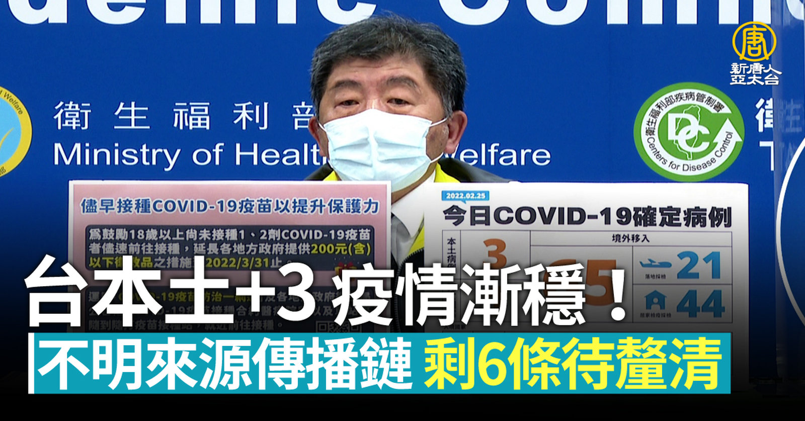 來關心台灣疫情,今天(25日)台灣有65例境外移入個案,而本土個案只新增3個,包括一對感染源待釐清的雙北父子,指揮中心醫療應變組副組長羅一鈞說明,之前的跨縣市家庭群聚、日翊物流都今日都監測期滿結案,還需要持續調查的 本土不明來源傳播鏈,目前只剩下6條。 //asset2.ntdtv.com.tw/public/uploads/assets/2022/02/25/2022-02-25-6218ce10420f9.mp4 中共病毒|境外移入|感染源|高雄港|日翊物流|202202252022-02-25 22:02:39