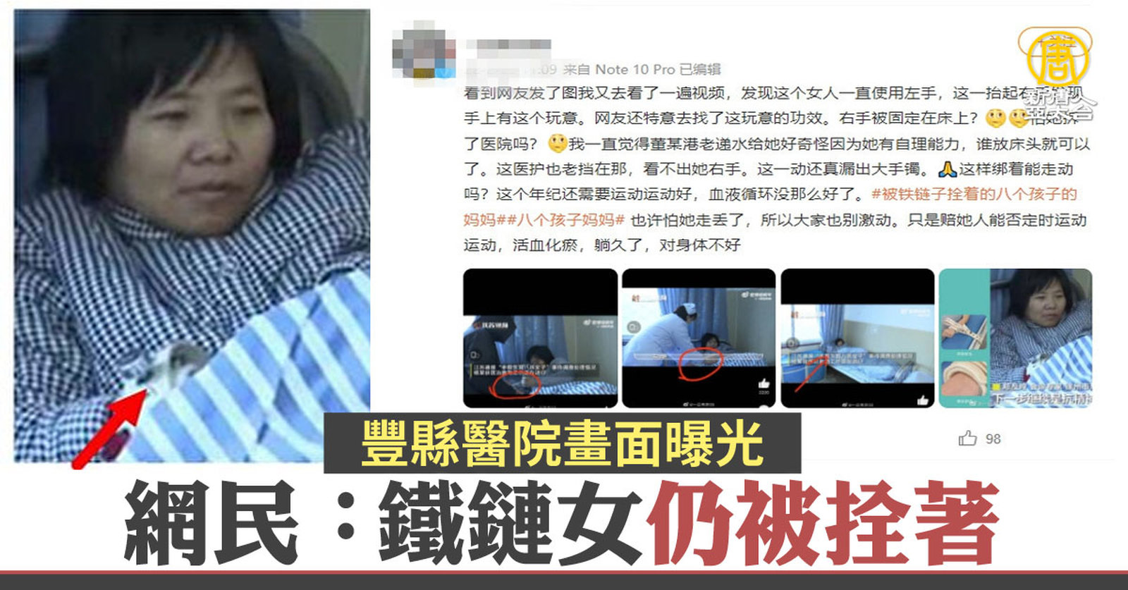 江蘇發布徐州「鐵鏈女」(八孩母)事件的最新調查報告之後,陸媒發布一個「鐵鏈女」住院的視頻,網友發現她仍被鎖著拴在病床上,質問「怕她拆了醫院嗎?」另外,在醫院陪護的還有董家長子,由於他曾舉報發帖聲援鐵鏈女的作家西原秋,引起網民熱議。陸媒也曾因此質疑幕後是否有當地官員的策劃? //asset2.ntdtv.com.tw/public/uploads/assets/2022/02/25/2022-02-25-6218d1829dfe1.mp4 中國一分鐘|飼料|大陸進口玉米|烏克蘭|俄羅斯|鐵鏈女|八孩母|紅二代|清零|202202252022-02-25 22:06:23