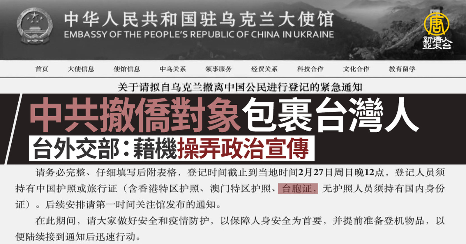 俄羅斯24日對烏克蘭展開軍事行動後,中共駐烏克蘭大使館,25日宣布撤僑計劃,並宣稱持台胞證也能登記搭乘包機。對此,中華民國外交部發言人歐江安表示,這再次證明中共藉烏克蘭國難,操弄政治宣傳,企圖詆毀中華民國政府形象,只會增加台灣人民的反感。陸委會則說,對於僑民我方早有安排,完全不需要中共越俎代庖。 //asset1.ntdtv.com.tw/public/uploads/assets/2022/02/25/2022-02-25-6218d631df7e0.mp4 俄烏局勢|俄羅斯|烏克蘭|撤僑|台胞證|包機|外交部|歐江安|202202252022-02-25 22:05:39