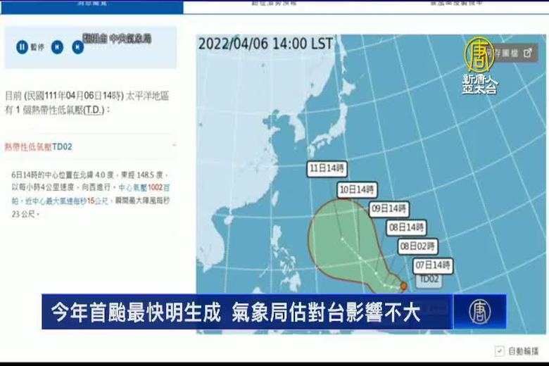 台灣今年第一個颱風要來了嗎?首颱「馬勒卡」最快可能明天(7日)就會生成。氣象局表示,今天(6日)下午,在菲律賓東方海面生成一個熱帶性低氣壓,以每小時4公里的速度向西前進。而這熱帶性低氣壓,可能在24小時內,發展成輕度颱風,初估短期內對台灣天氣沒有直接影響。預估明天東北季風增強,東北部要防較大雨勢,北部高溫略降攝氏3、4度。 //asset1.ntdtv.com.tw/public/uploads/assets/2022/04/06/2022-04-06-624d9168d27e1.mp4 颱風|天氣|氣象局|天氣預報|202204062022-04-06 22:29:14