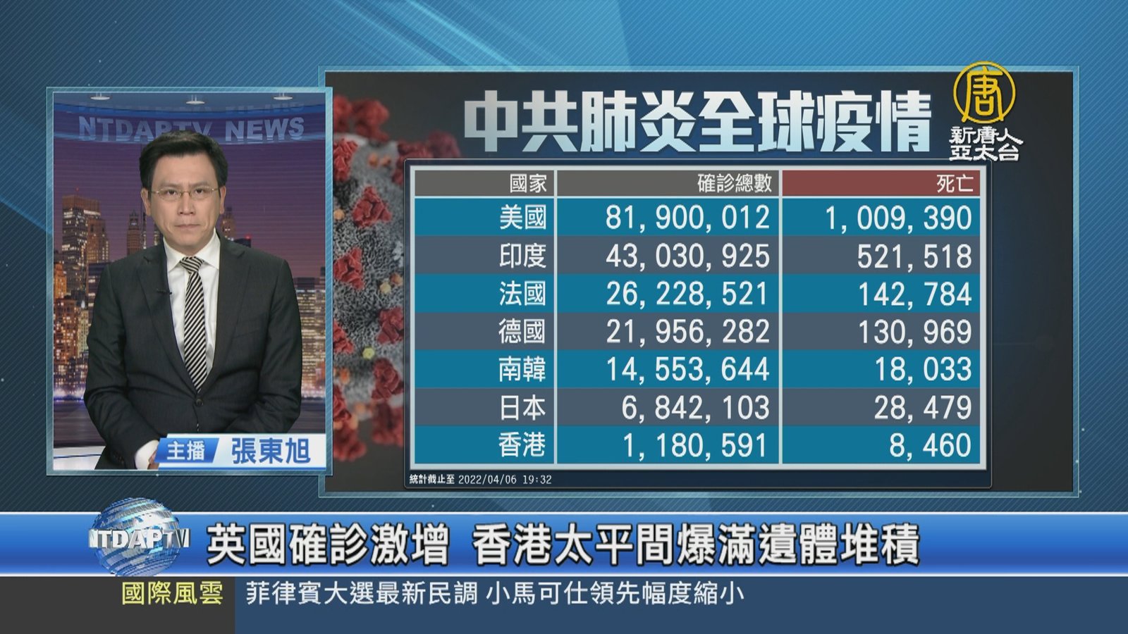 來關心中共肺炎疫情最新情況,全球確診超過4億9千4百19萬例,死亡6百18萬3千多人。但中共、伊朗、北韓等政權,被認為嚴重低報數據。亞洲方面,南韓新增28萬6千多例確診,比前一天增加2萬多例,現有重症患者連續五天保持在1千1百例以上。日本新增確診超過5萬4千例,其中東京增加8千6百多人。香港近日確診數字稍見緩和,新增2千7百多例確診,但染疫死亡再增1百11人,累計死亡達8千4百60人,遺體數量超出太平間負荷,出現遺體堆積,甚至腐爛的情形。歐洲的英國確診病例再度激增,新增5萬1千多例,多家航空公司因為太多職 //asset2.ntdtv.com.tw/public/uploads/assets/2022/04/06/2022-04-06-624d85c83b652.mp4 南韓|香港|太平間|遺體|日本|英國|確診|航班取消|中共病毒|202204062022-04-06 22:18:09