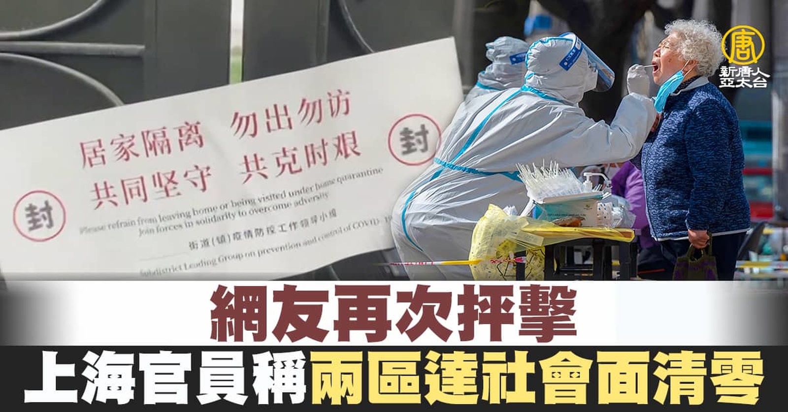 上海疫情嚴峻,據傳官方下令20日前社會清零,上海市衛健委今天(20日)宣布,金山和崇明區首日達到社會面清零目標,不過,中國網友可不買單,紛紛表示「不管你信不信,反正我是不信」,嘲諷上海當局為完成政治任務,「掩耳到零」。時事評論員橫河表示,社會面清零就是一種妥協,陽性都隔離和轉移了,社會面清零就完成了。 //asset2.ntdtv.com.tw/public/uploads/assets/2022/04/20/2022-04-20-625ffb658cdf5.mp4 中共病毒|溫柔清零|中共|上海|二十大|清零政策|橫河|202204202022-04-20 22:07:40