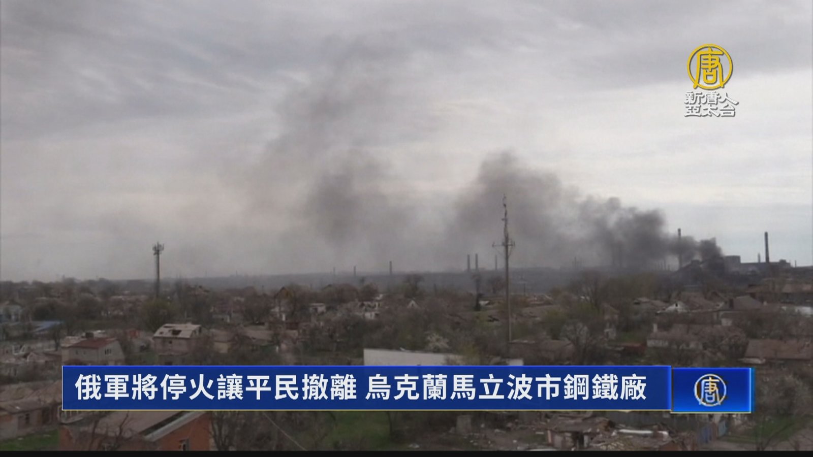 歡迎回來。俄羅斯入侵烏克蘭進入第三個月,俄國官媒塔斯社引述俄羅斯國防部說法,表示莫斯科時間25日下午2點,也就是台灣時間今天晚上7點開始,俄軍在烏克蘭南部港市馬立波的亞速鋼鐵廠周邊實施停火,讓受困平民離開。俄羅斯國防控制中心負責人米茲殷塞夫聲稱,出於人道主義原則,俄羅斯武裝部隊會單方面停止所有軍事活動,確保烏克蘭平民能從他們自己選擇的路線撤出。烏克蘭亞速軍團日前上傳影片,表示許多婦女和兒童,已經躲在馬立波亞速鋼鐵廠2個多月,食物快要吃完,小孩在影片中直呼「想看到太陽」。 //asset3.ntdtv.com.tw/public/uploads/assets/2022/04/25/2022-04-25-62669a9fe7873.mp4 俄烏局勢|俄羅斯|烏克蘭|亞速鋼鐵廠|馬立波|202204252022-04-25 21:35:30
