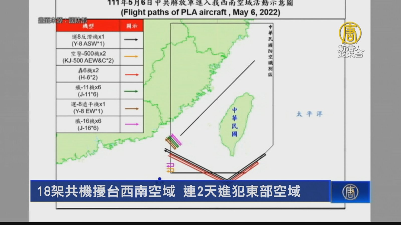 中共今天一次派出18架次軍機,襲擾台灣西南空域,中華民國國防部公布即時軍事動態,今天(6日)有18架次共機襲擾台灣西南空域,包含2架「空警500」預警機、6架「殲11」戰機、1架「運8」遠干機、6架「殲16」戰機,另有1架「運8」反潛機,和2架「轟6」轟炸機,長航繞過巴士海峽到達台灣東南部海空域,推測與共軍「遼寧號」在西太平洋區域操演有關,這已是共機連續2天進入東部空域;空軍依慣例派遣空中巡邏兵力應對、廣播驅離、防空飛彈追監。 //asset2.ntdtv.com.tw/public/uploads/assets/2022/05/06/2022-05-06-627512dd8165b.mp4 共機|台灣|西南空域|東部空域|202205062022-05-06 21:57:02
